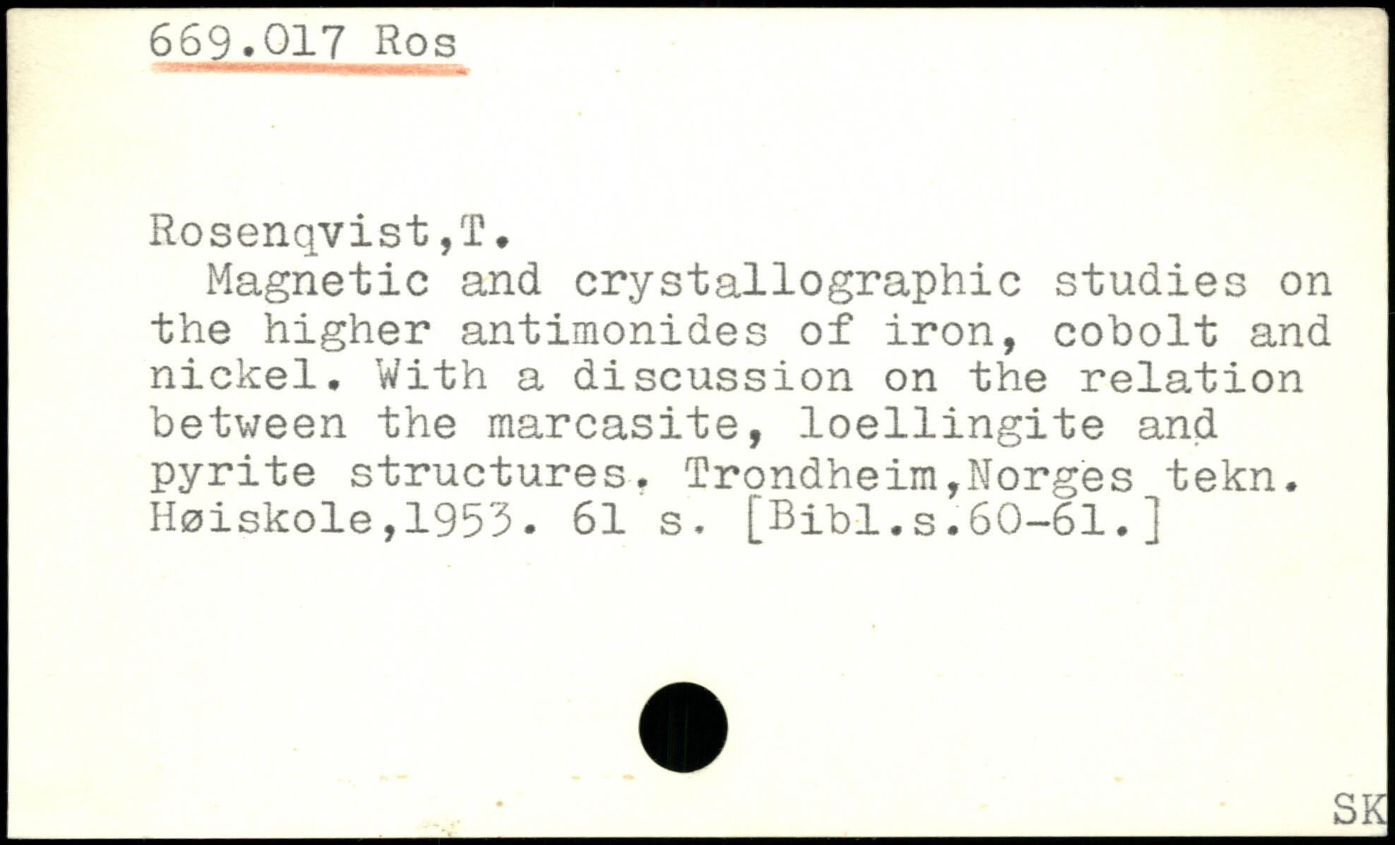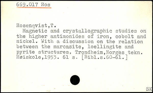 Magnetic and crystallographic studies on the higher antimonides of iron, cobolt and nickel. With a discussion on the relation between the marcasite, loellingite and pyrite structures. Trondheim,Norges tekn. Hoiskole,1953.