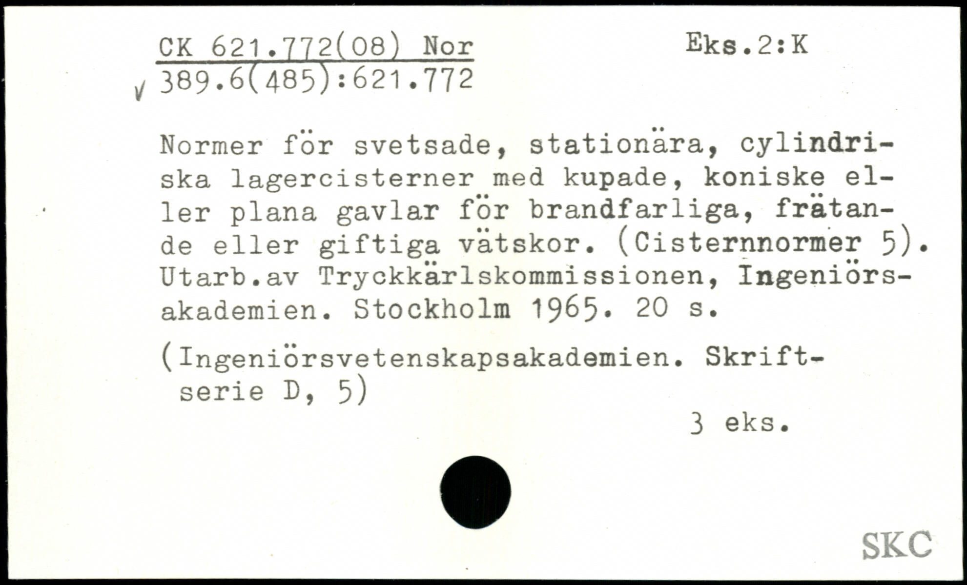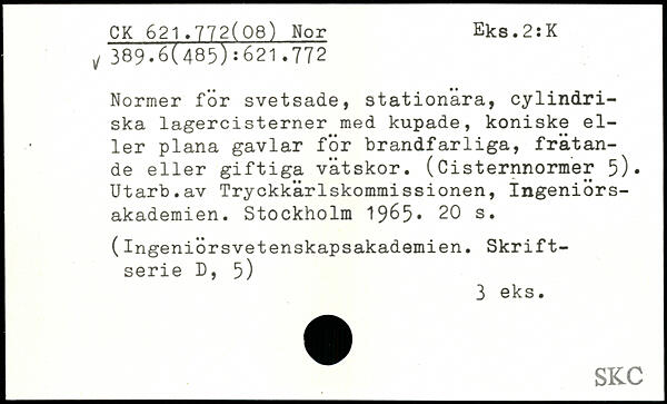 Normer for svetsade, stationära, cylindriska lagercisterner med kupade, koniske eller plana gavlar för brandfarliga, frätande eller giftiga vätskor. (Cisternnormer 5), Utarb.av Tryckkärlskommissionen, Ingeniörs-akademien.