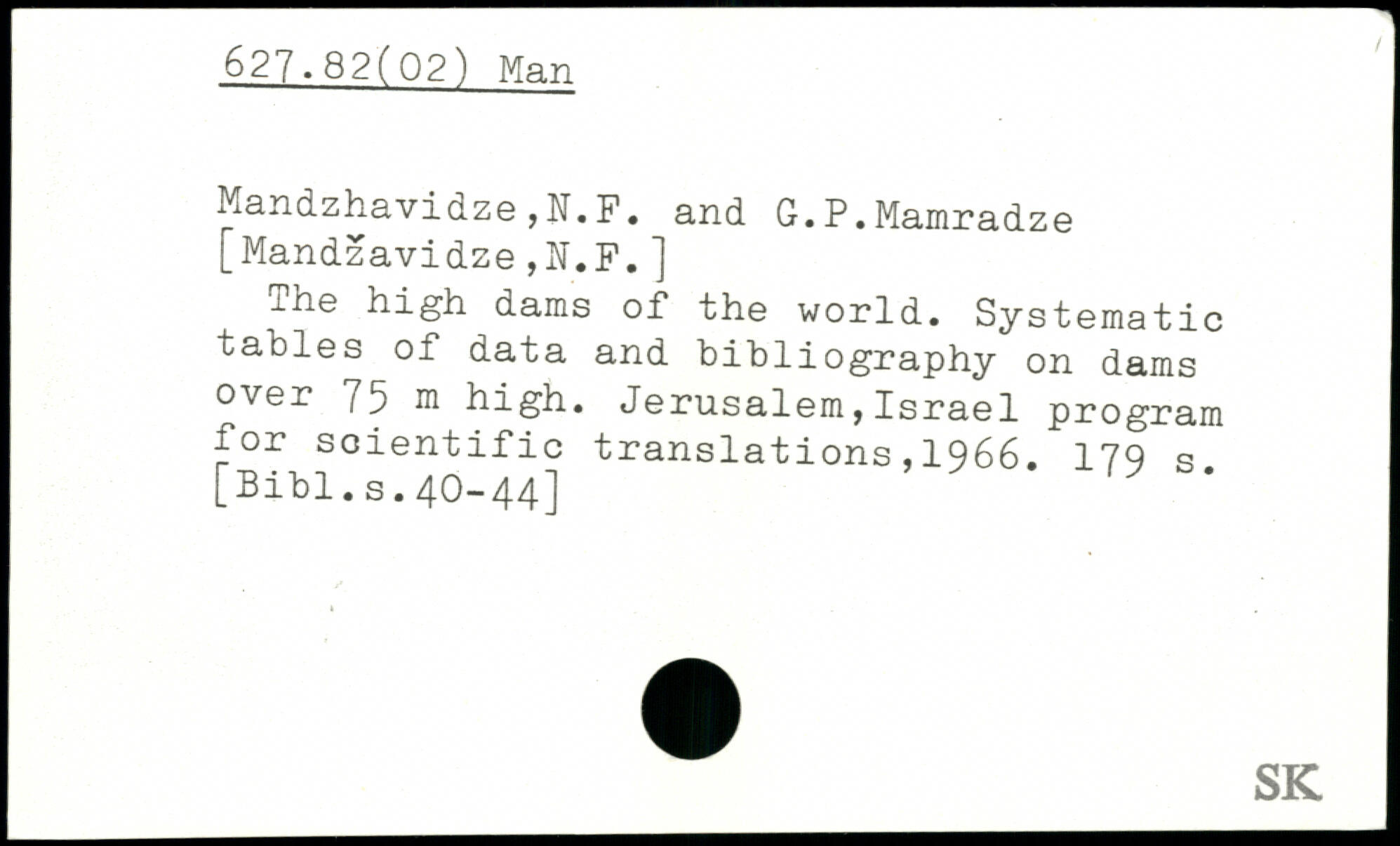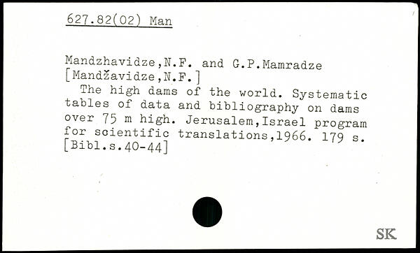 Mandzhavidze, N. F. and G.P.Mamradze [Mandzavidze,N.F.] The high dams of. the world. Systematic tables of data and bibliography on dams over 75 m high. Jerusalem,Israel program for scientific translations,1966.