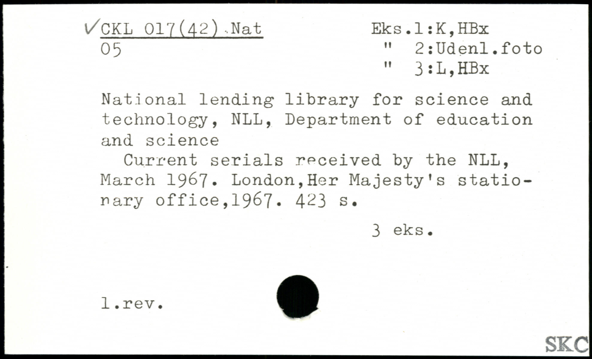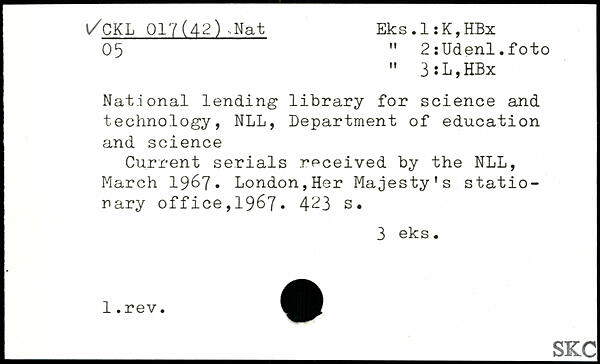 National lending library for science and technology, NLL, Department of education and science Current serials received by the NLL, March 1967, London,Her Majesty's stationary office,1967.