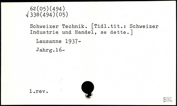 Schweizer Technik. [Tidl.tit.î Schweizer Industrie und Handel, se dette.] Lausanne 1937- J ahrg.16- l.rev.