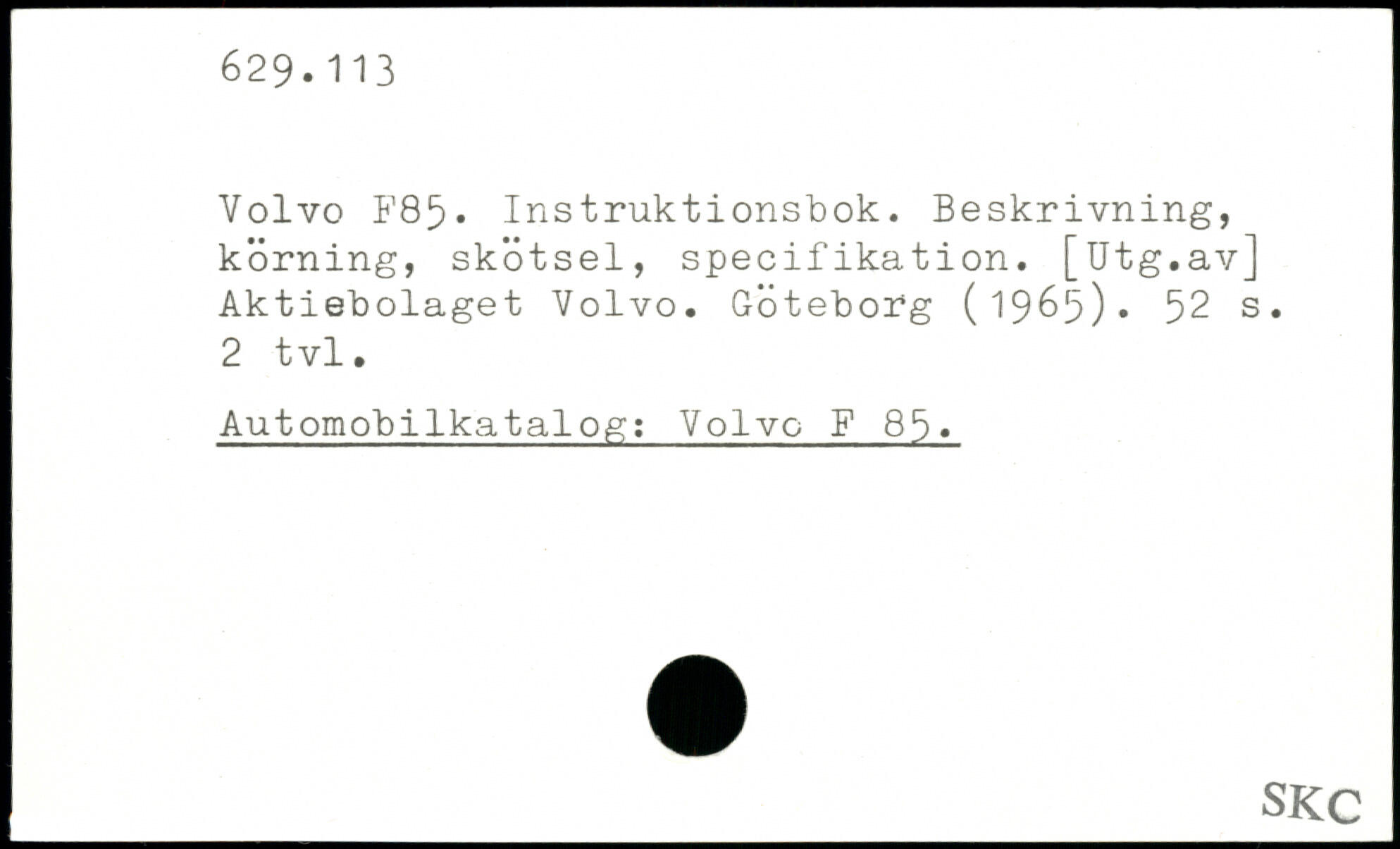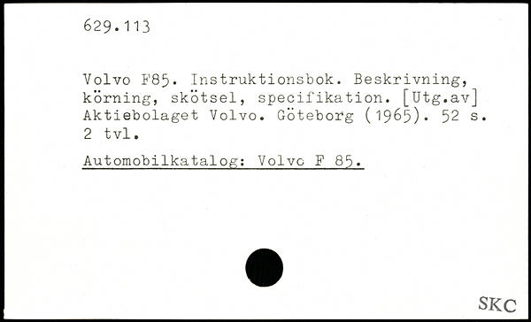 Volvo F85. Instruktionsbok. Beskrivning, körning, skötsel, specifikation. [Utg.av] Aktiebolaget Volvo. Göteborg (1965).