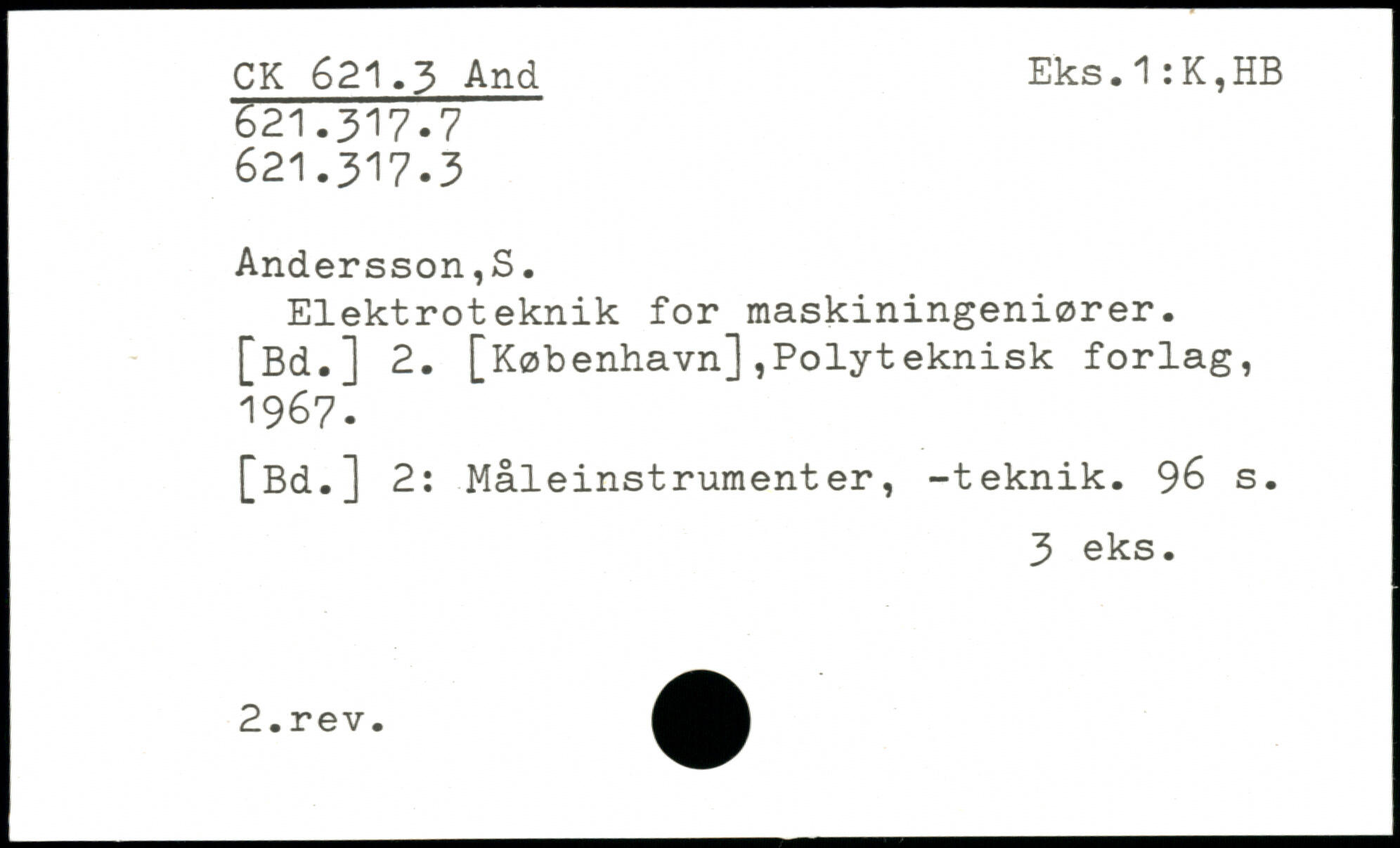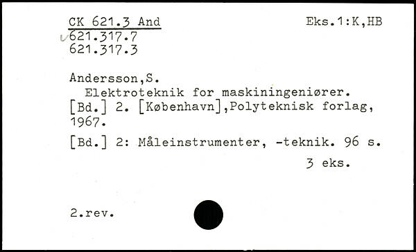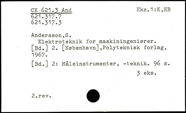 Elektroteknik for maskiningeniører. [Bd.] 2. [København],Polyteknisk forlag, 1967. [Bd.] 2: Måleinstrumenter, -teknik.