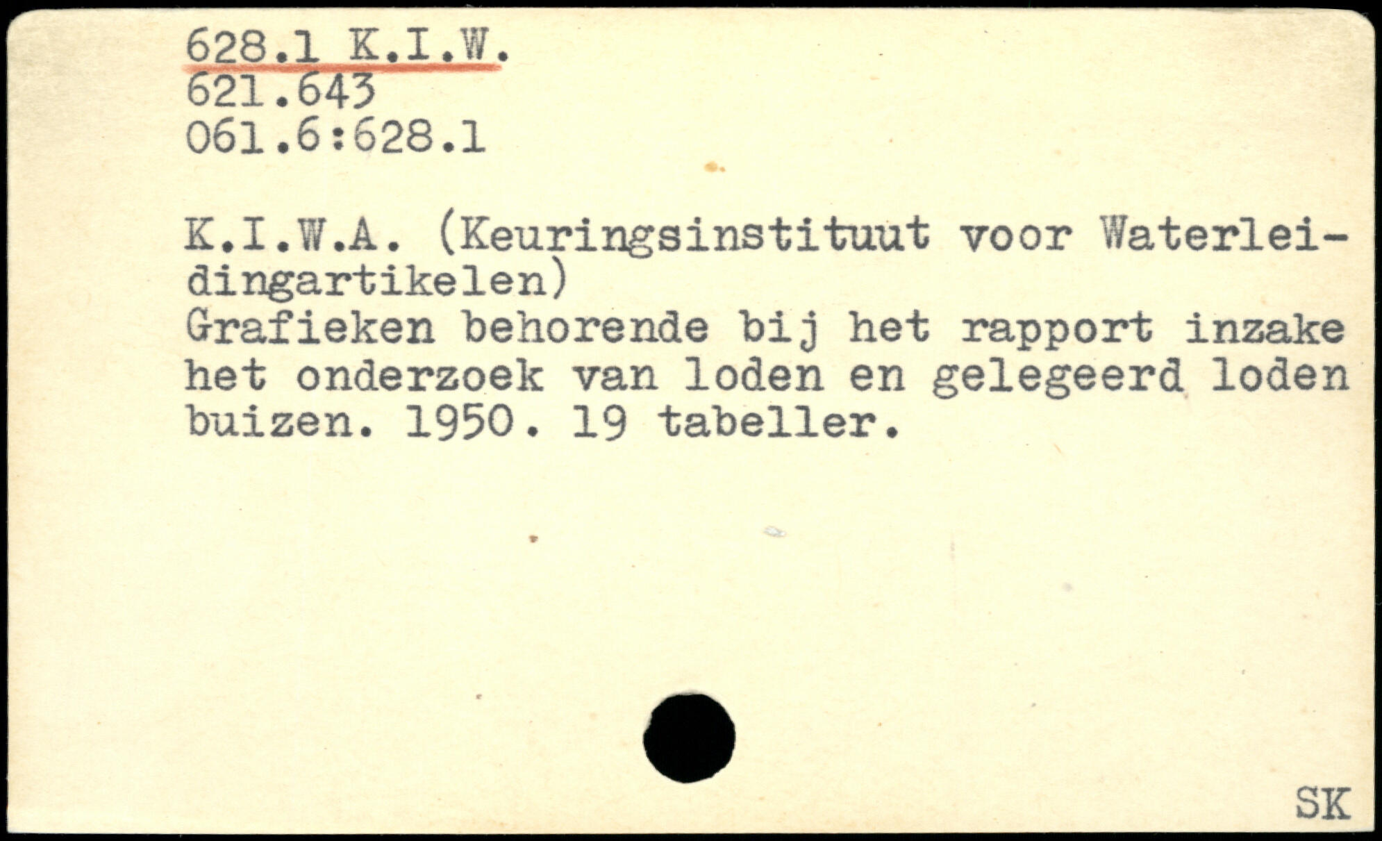 K.I.W.A. (Keuringsinstituut voor Waterlei-dingartikelen) Grafieken behorende bij het rapport inzake het onderzoek van loden en gelegeerd loden buizen. 1950. 19 tabeller.
