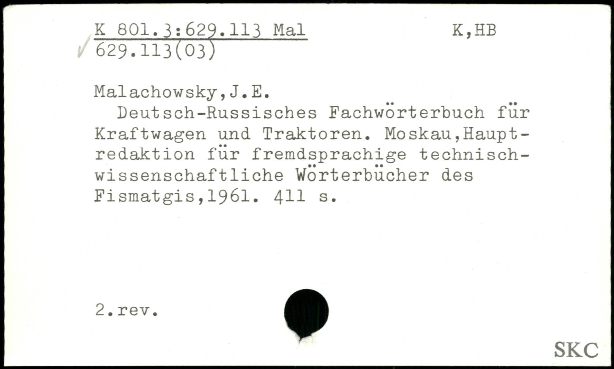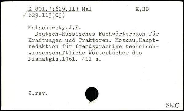 Deutsch-Russisches Fachwörterbuch für Kraftwagen und Traktoren. Moskau,Haupt -redaktion für fremdsprachige technischwissenschaftliche Wörterbücher des Fismatgis , 1961. 4H s.
