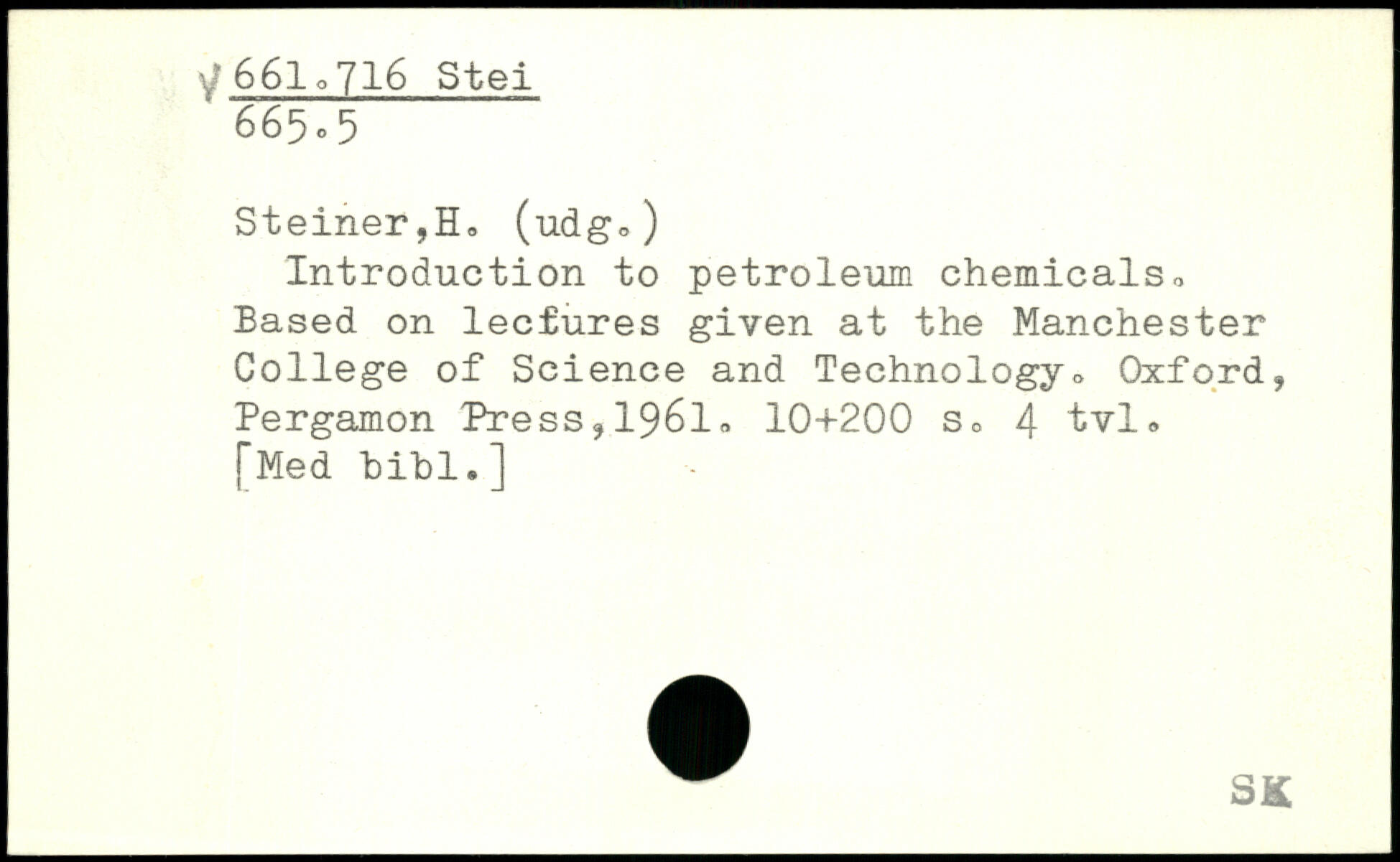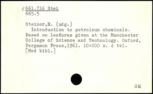 Steiner,H. (udg.) Introduction to petroleum chemicalso Based on lectures given at the Manchester College of Science and Technology<>