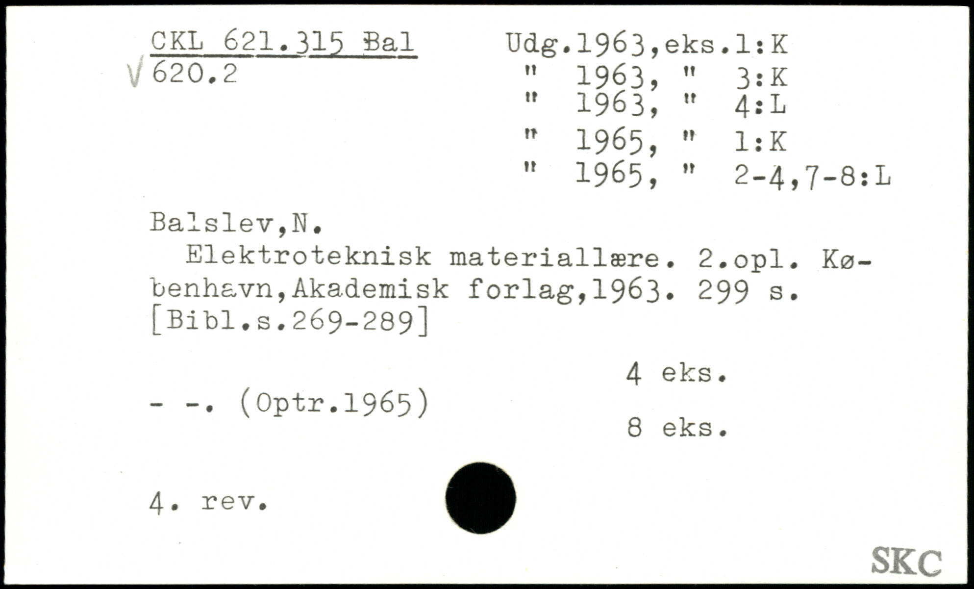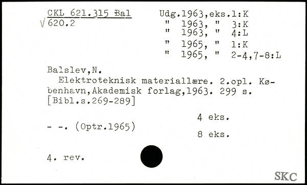 " 1963, " 4:L " 1965, " 1:K " 1965, ,r 2-4,7-8: L Balslev,N. Elektroteknisk materiallære. 2.opl.