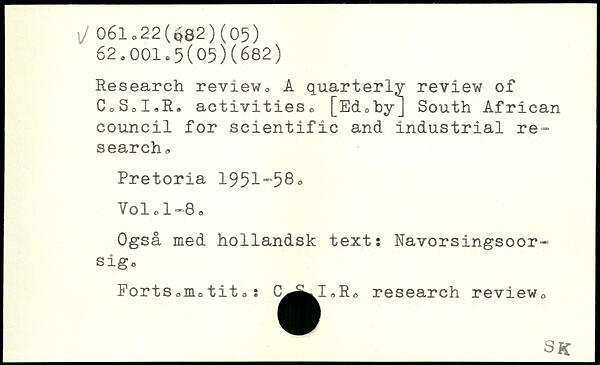 Research review, A quarterly review of CoSoI9R. activities,, [EdobyJ South African council for scientific and industrial research , Pretoria 1951”58. Vol,1-8. Også med hollandsk text: Ravorsingsoor- sig, Forts0m0 tit. : ^^^E0Ro research review