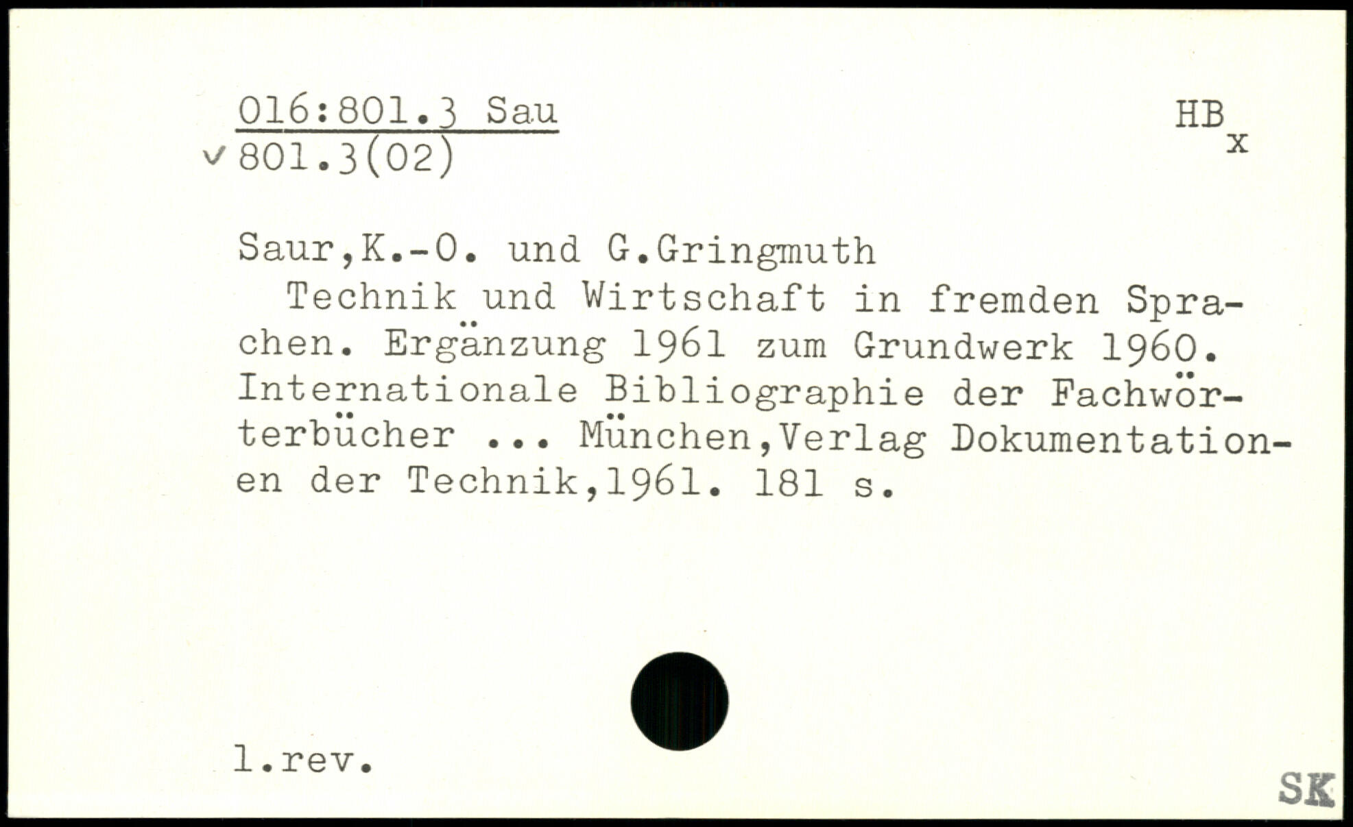 Technik und Wirtschaft in fremden Sprachen. Ergänzung 1961 zum Grundwerk 1960. Internationale Bibliographie der Fachwörterbücher ...