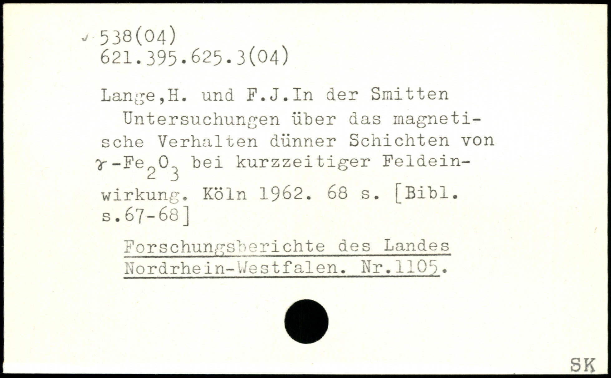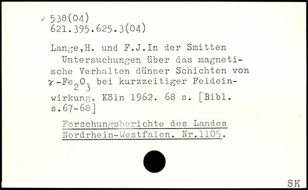 Lange,H. und F.J.In der Smitten Untersuchungen über das magnetische Verhalten dünner Schichten von ^-Fe^O^ bei kurzzeitiger Feldeinwirkung.