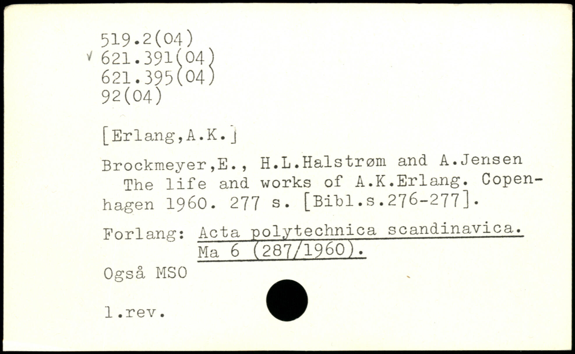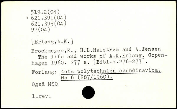 Brockmeyer,E., H.L.Halsfrom and A. Jensen The life and works of A.K.Erlang.
