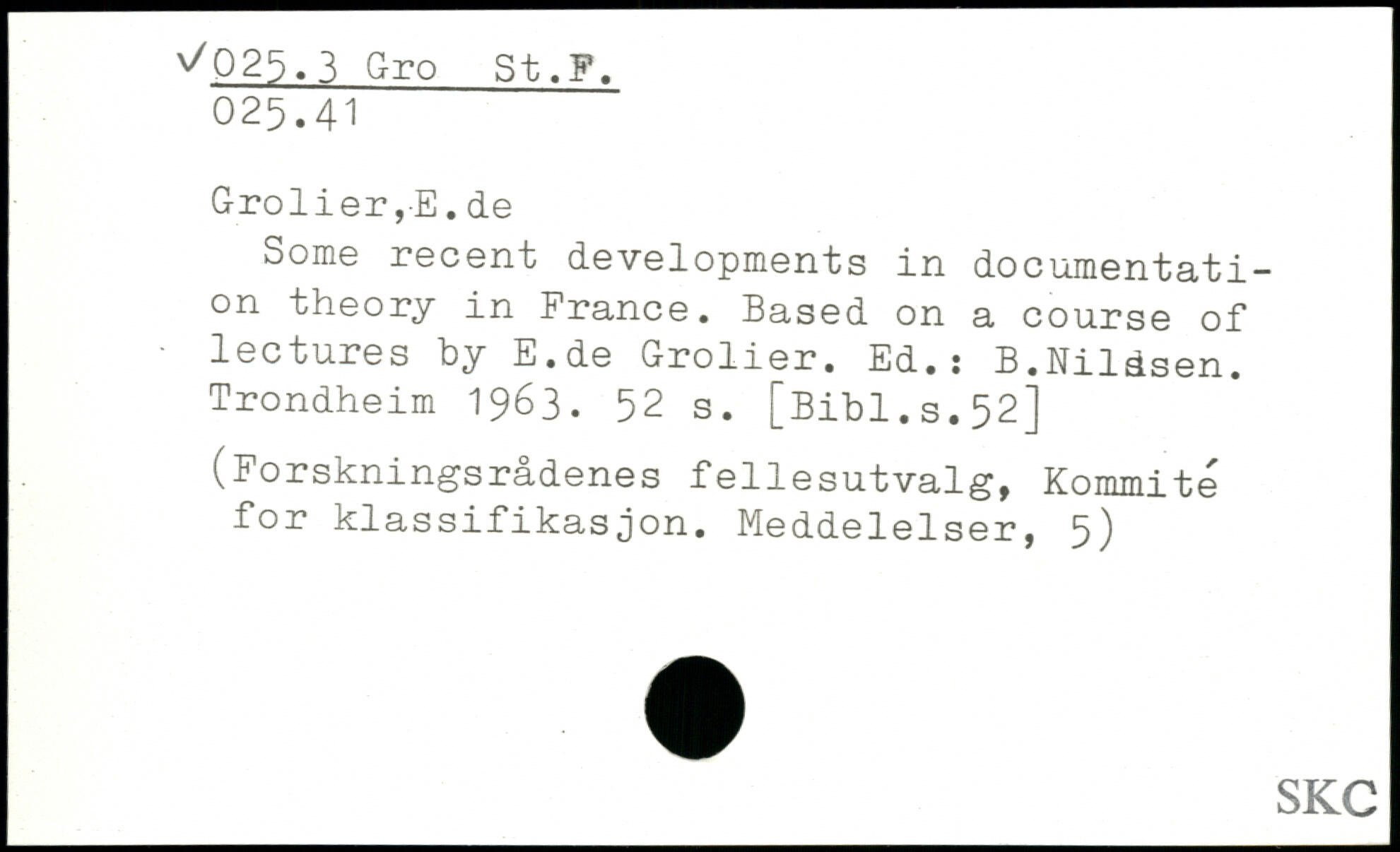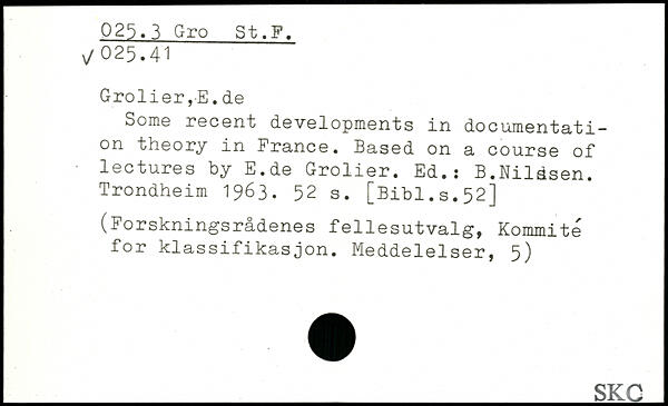 Some recent developments in documentation theory in Prance. Based on a course of lectures by E.de Grolier. Ed.: B.Nildsen.