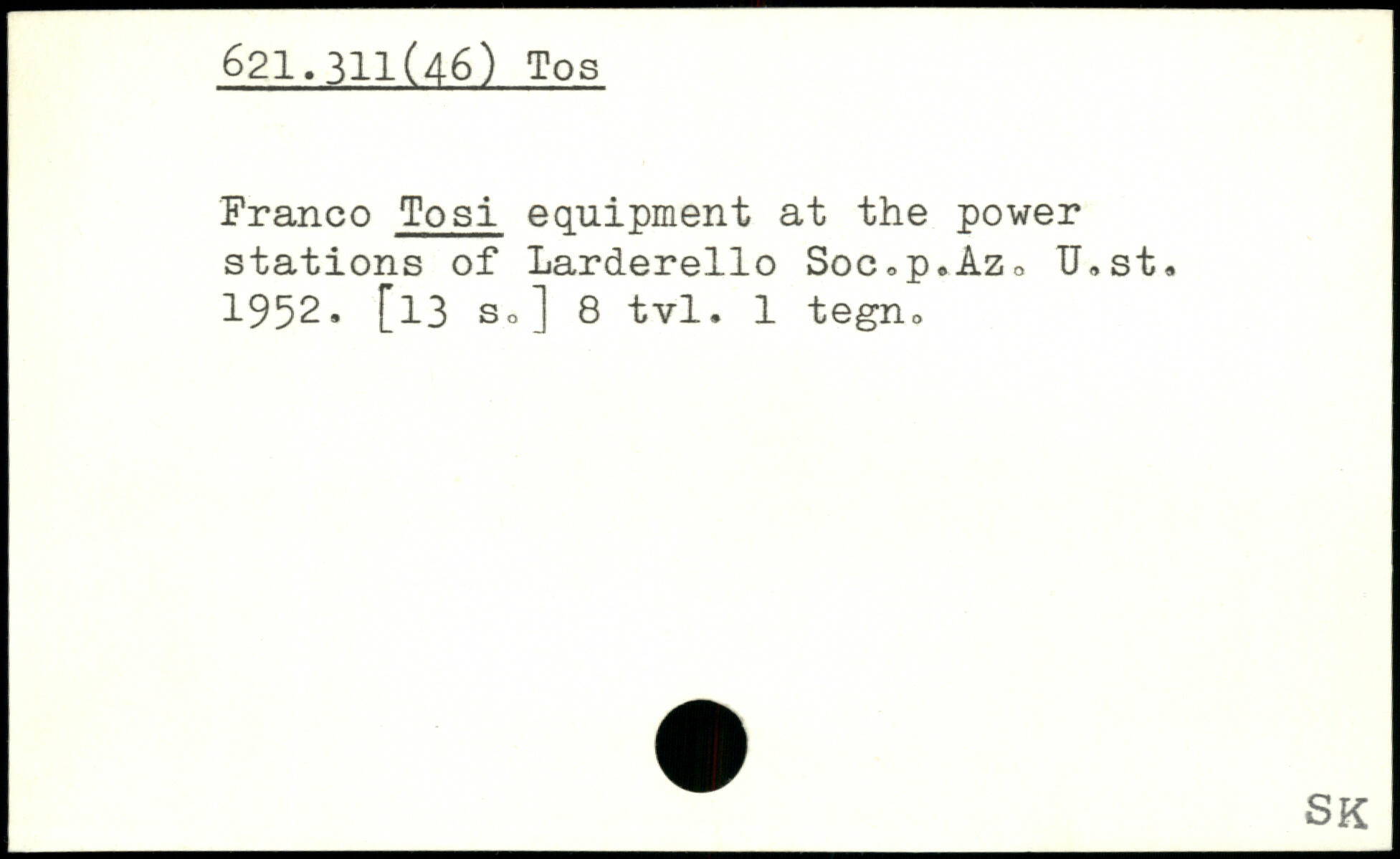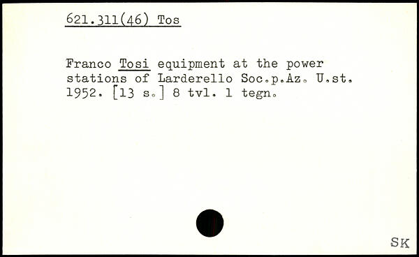 Franco Tosi equipment at the power stations of Larderello Soc<,p.Az. U.st. 1952. [l