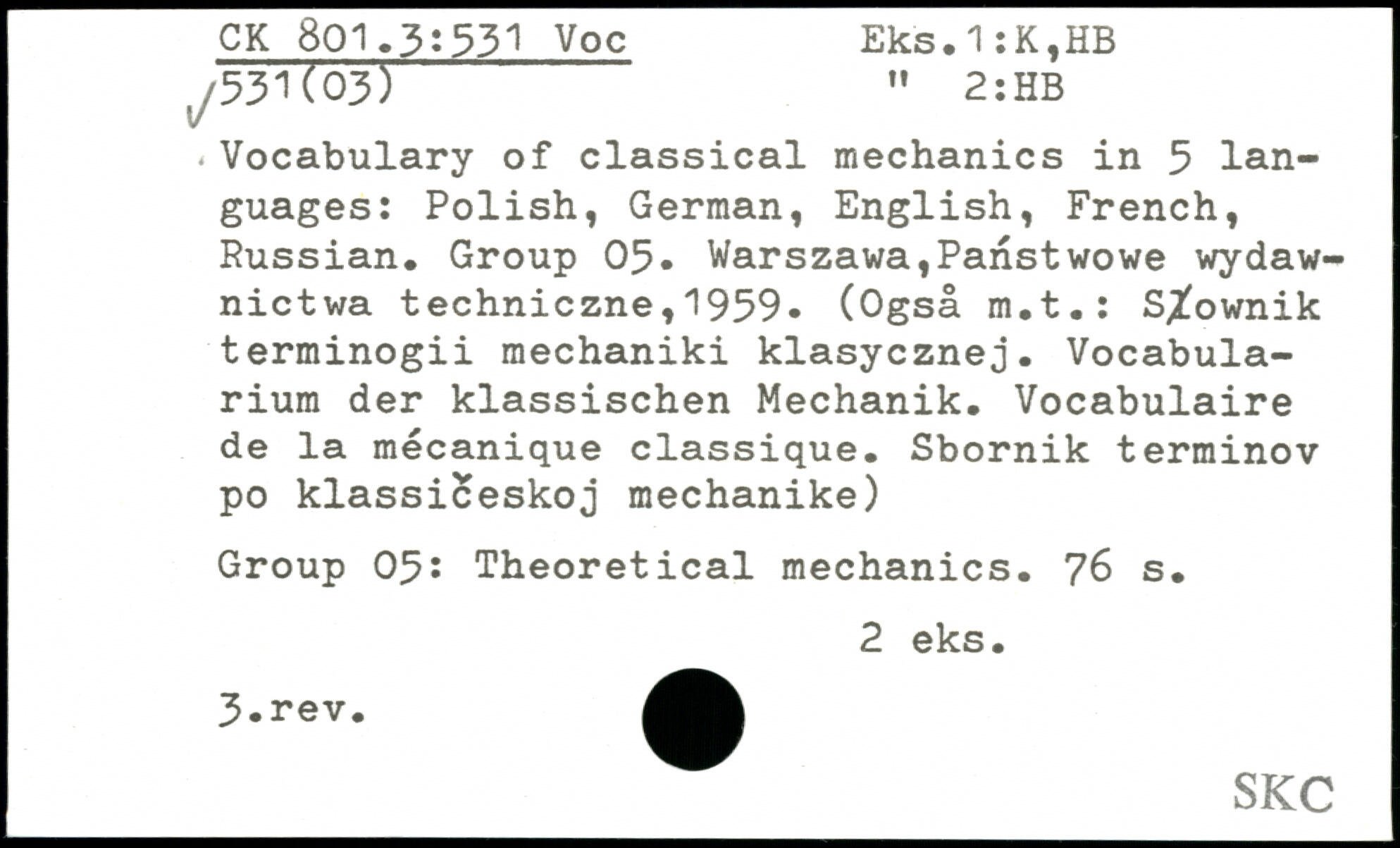 - Vocabulary of classical mechanics in 5 languages: Polish, German, English, French, Russian. Group 05. Warszawa,Panstwowe wydaw-nictwa techniczne,'1959- (Ogsâ m.t.: S^ownik terminogii mechaniki klasycznej. Vocabula-rium der klassischen Mechanik. Vocabulaire de la mécanique classique. Sbornik terminov po klassiceskoj mechanike) Group 05: Theoretical mechanics. ?