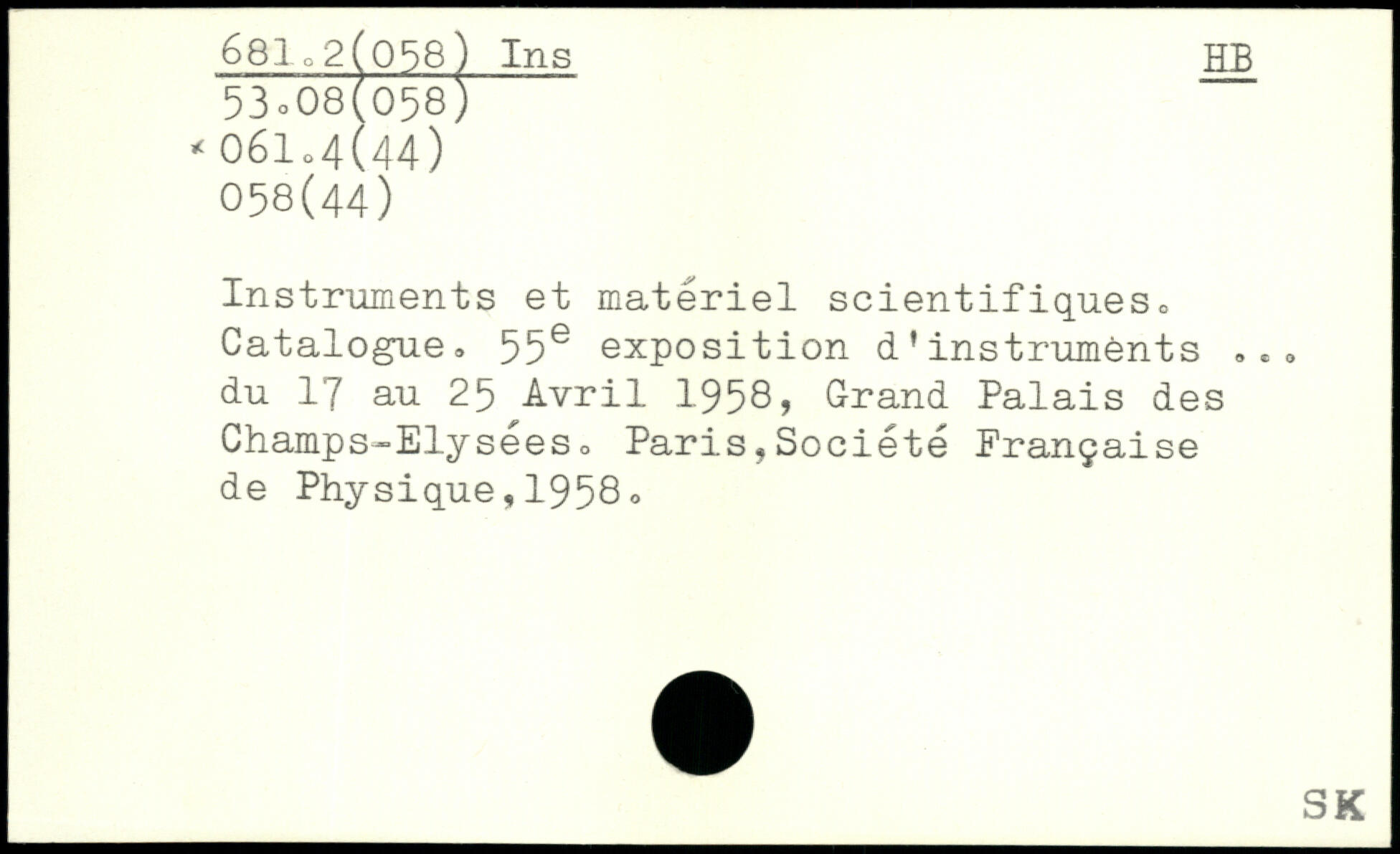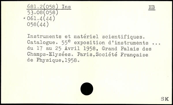 Instruments et materiel scientifiqueso Catalogue. 55e exposition d’instruments ... du 17 au 25 Avril 1958, Grand Palais des Champs-Elysées. Paris,Société Française de Physique,19580