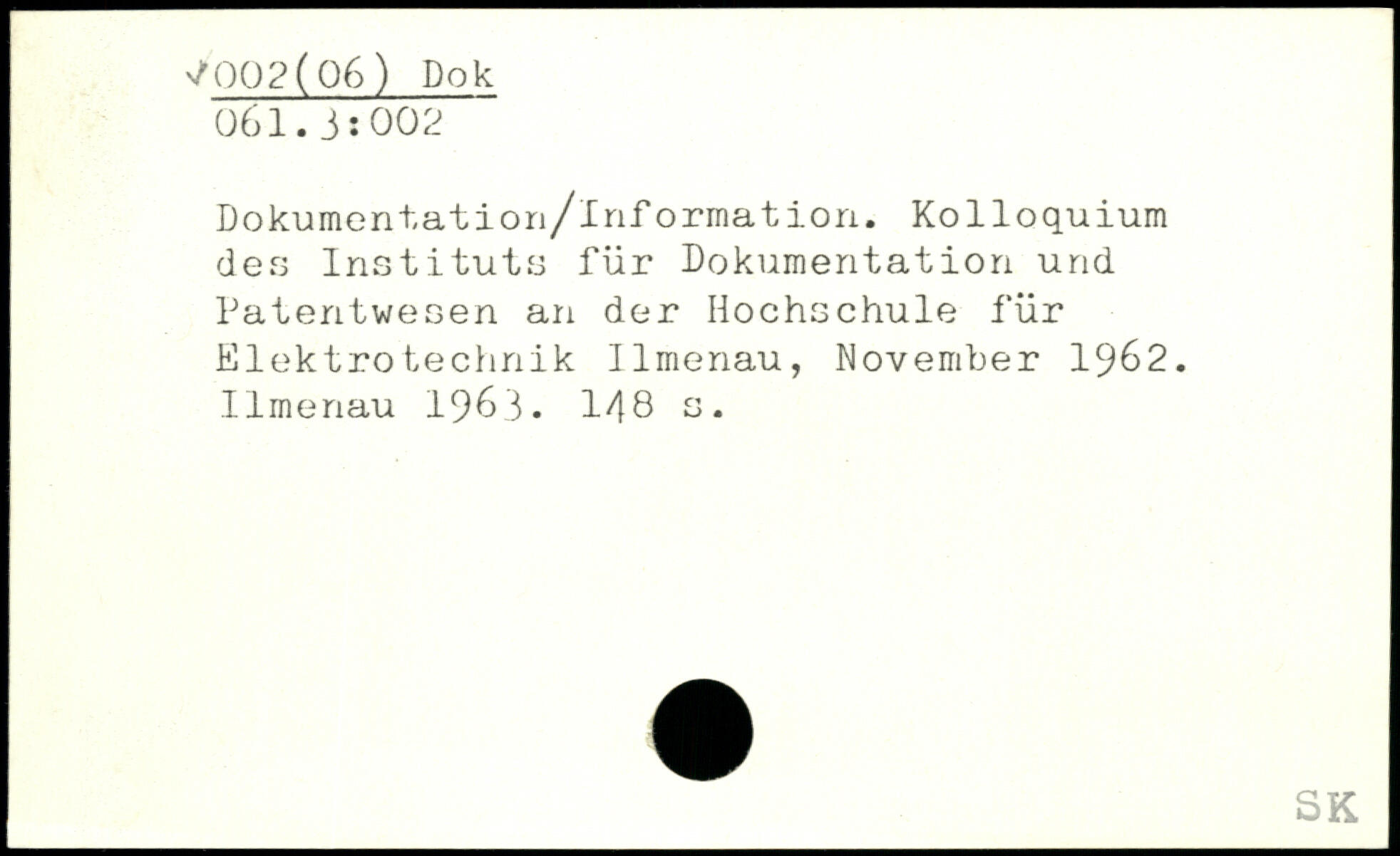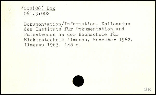 Dokumentation/lnformation. Kolloquium des Instituts für Dokumentation und Patentwesen an der Hochschule für Elektrotechnik Ilmenau, November 1962. Ilmenau 1963.
