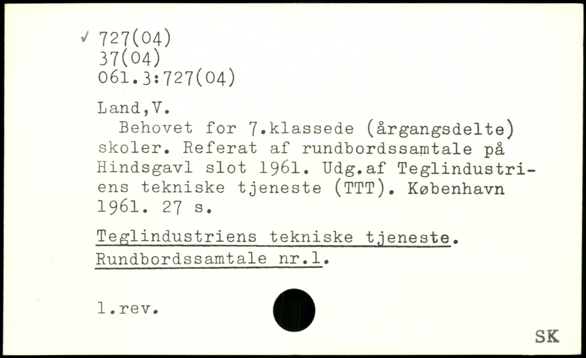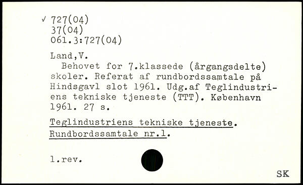 Behovet for 7,klassede (årgangsdelte) skoler. Referat af rundbordssamtale på Hindsgavl slot 1961. Udg.af Teglindustriens tekniske tjeneste (TTT).