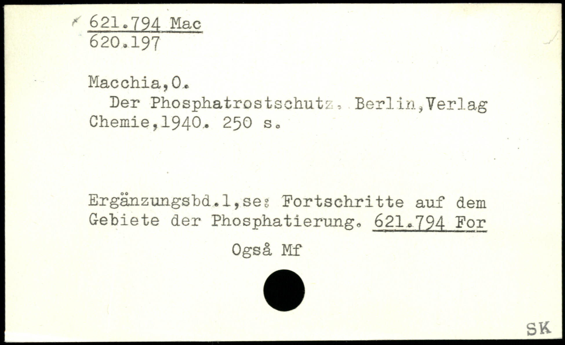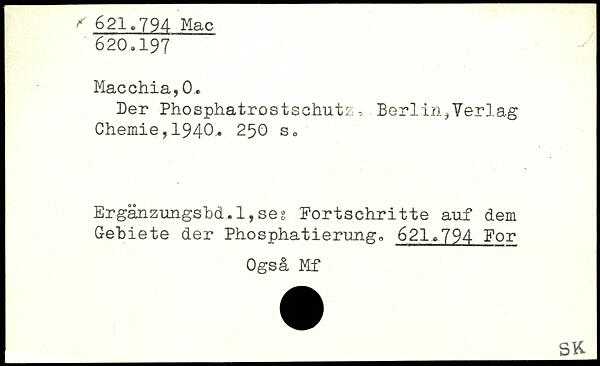 Der Phosphatrostschutz, Berlin,Verlag Chemie, 1940.. 250 s, Ergänzungsbd.l,ses Fortschritte auf dem Gebiete der Phosphatierung. 621.794 For Ogsä Mf