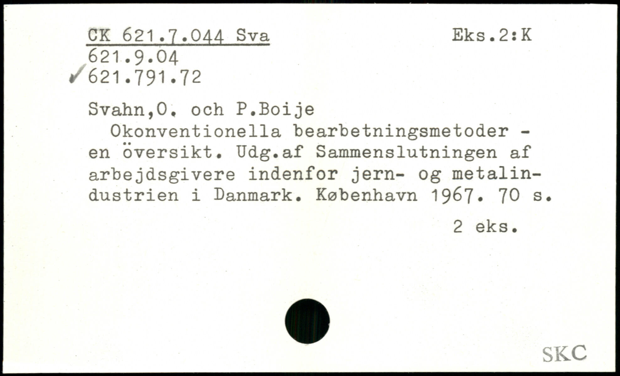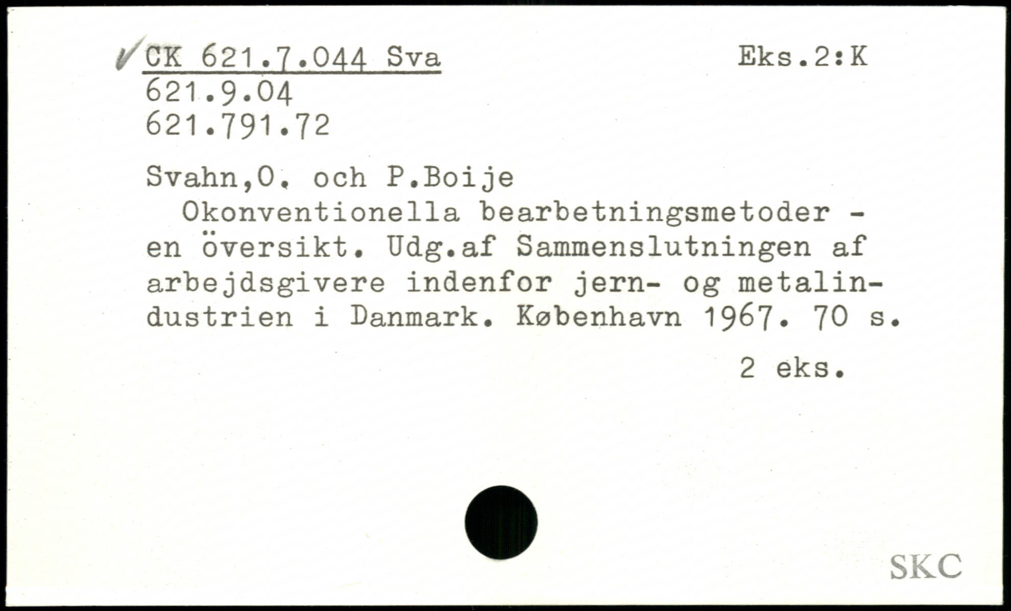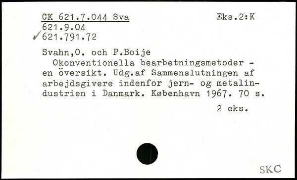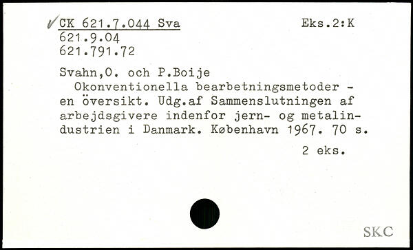 Svahn,0, och P.Boije Okonventionella bearbetningsmetoder -en översikt. Udg.af Sammenslutningen af arbejdsgivere indenfor jern- og metalindustrien i Danmark.