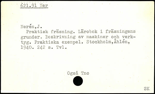 Praktisk fräsning. LäroBok i fräsningens grunder. Beskrivning av maskiner och verktyg. Praktiska exempel. Stockholm,Åhlén, 1940.