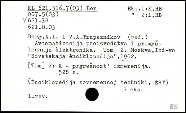 Avtomatizacija proizvodstva i promys-lennaja êlektronika. [Tom] 2. Moskva,Izd-vo "Sovetskaja ênciklopedija",1962. [Tom] 2ï K - pogresnost' ismerenija.