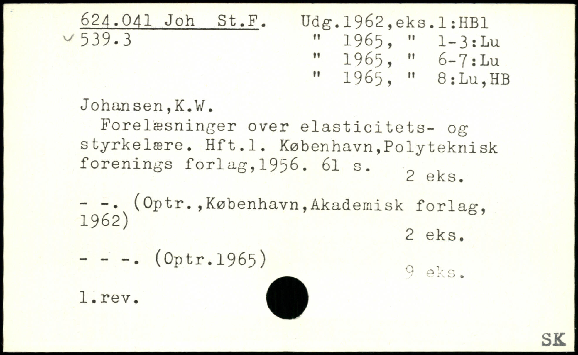 " 1965, " 8 : Lu, HB Johansen,K.W. Forelæsninger over elasticitets- og styrkelære. Hft.l.