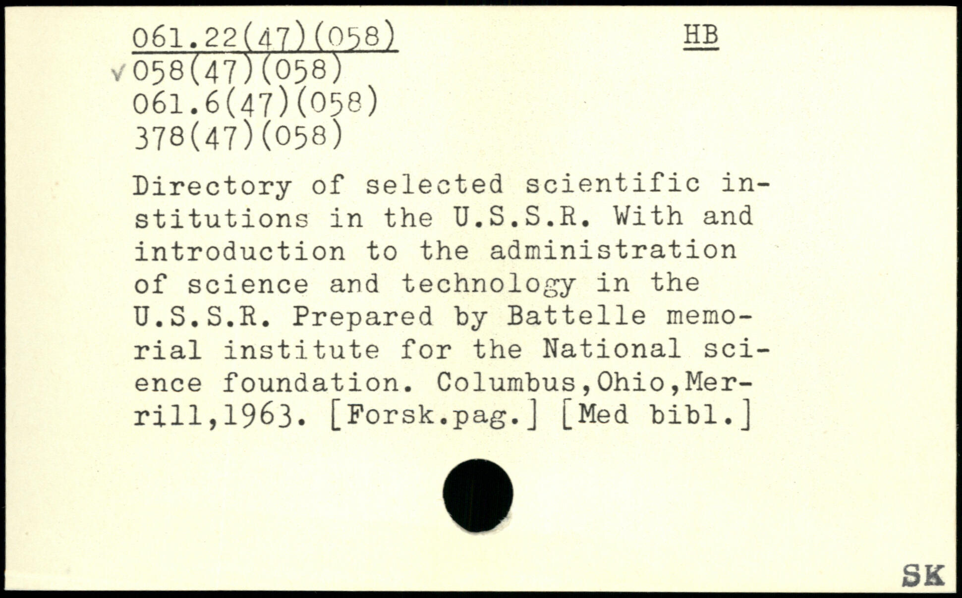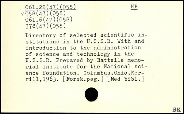 Directory of selected scientific institutions in the U.S.S.R. With and introduction to the administration of science and technology in the U.S.S.R. Prepared by Battelle memorial institute for the National science foundation.