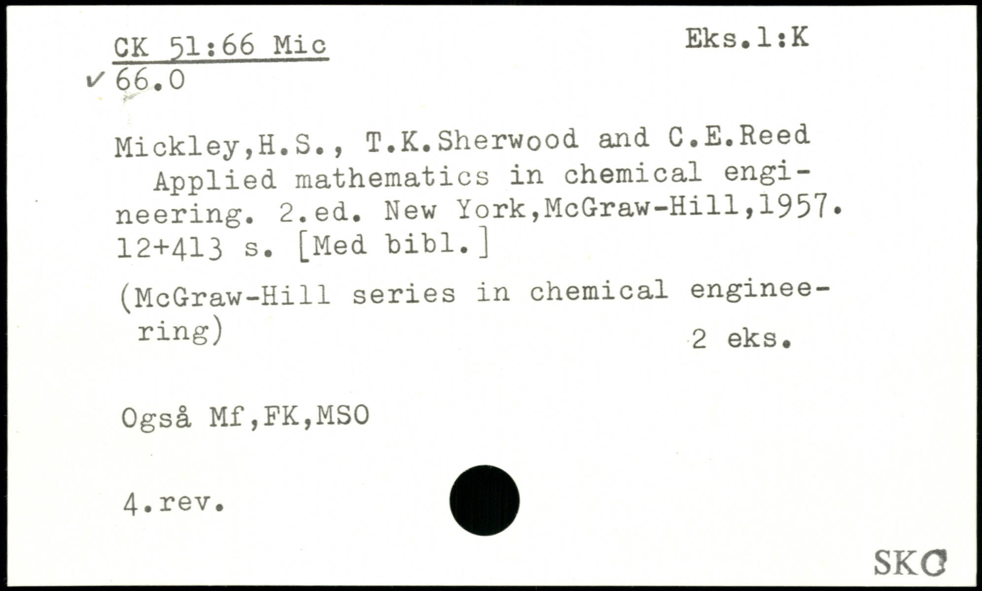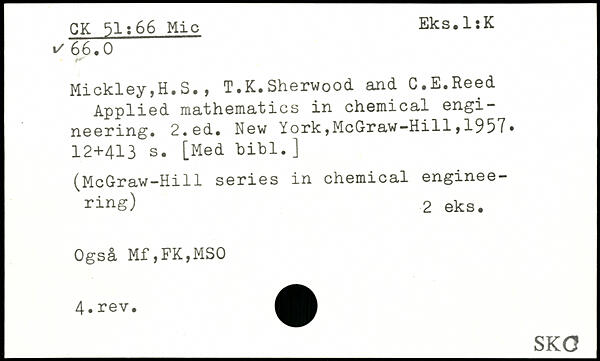 Mickley,H.S., T.K.Sherwood and C.E.Reed Applied mathematics in chemical engineering