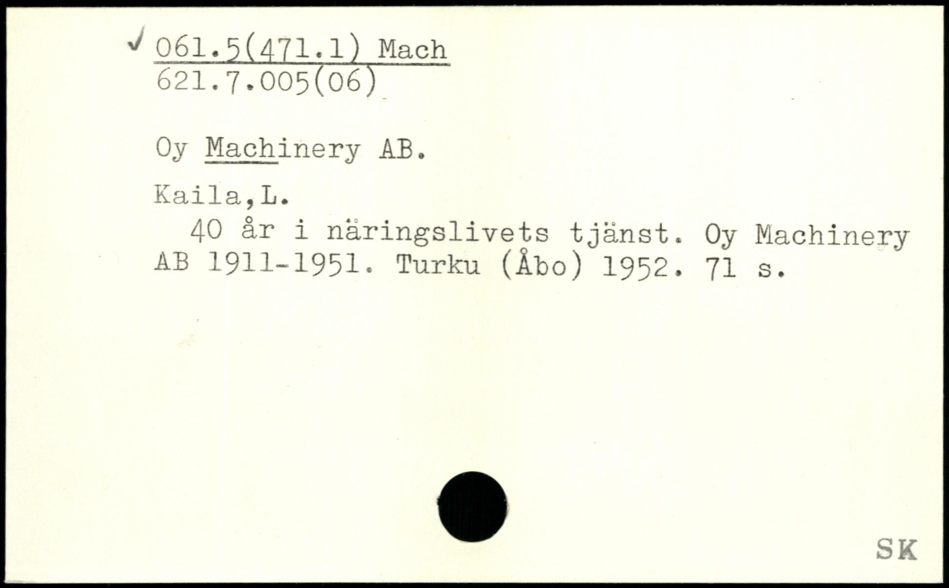 Kaila,L. 40 år i näringslivets tjänst. Oy Machinery AB 1911-1951. Turku (Åbo) 1952.