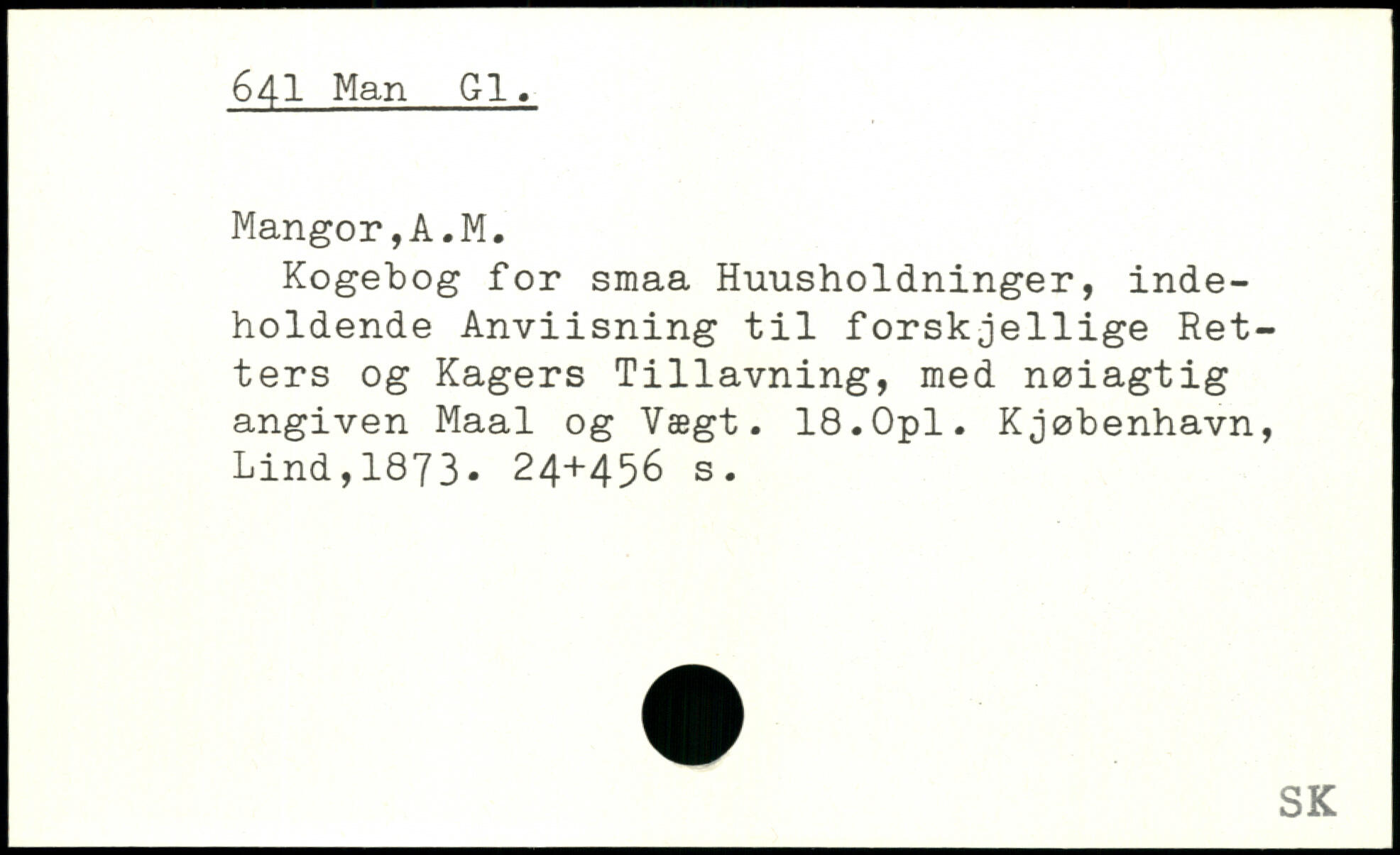 Kogebog for smaa Huusholdninger, indeholdende Anviisning til forskjellige Retters og Kagers Tillavning, med nøiagtig angiven Maal og Vægt. 18.0pl.
