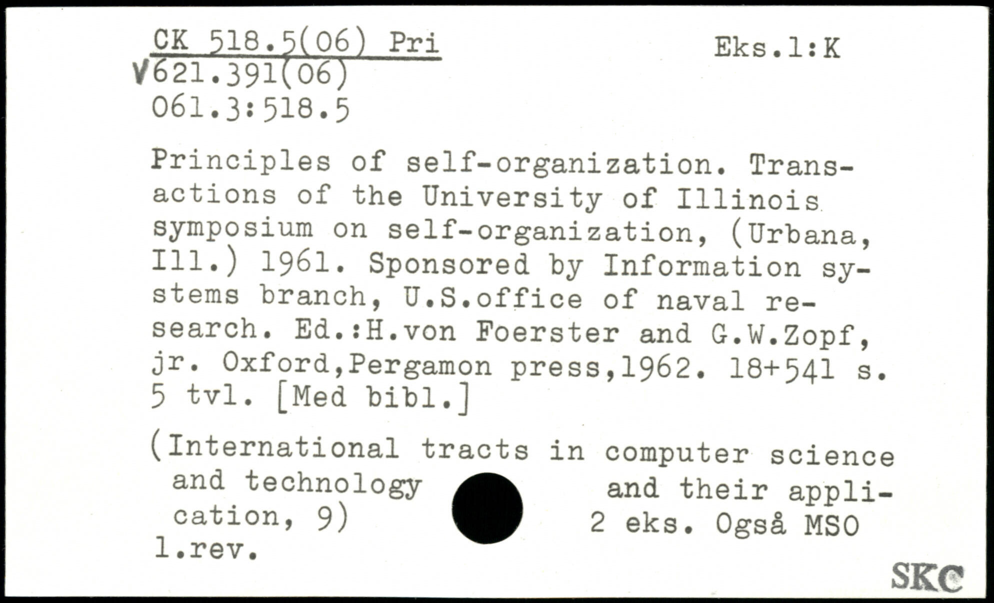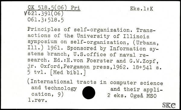 Principles of self-organization. Transactions of the University of 1111nois symposium on self-organization, (Urbana, 111.) 1961. Sponsored by Information systems branch, U.S.office of naval research. Ed.:H.von Foerster and G.W.Zopf, jr.