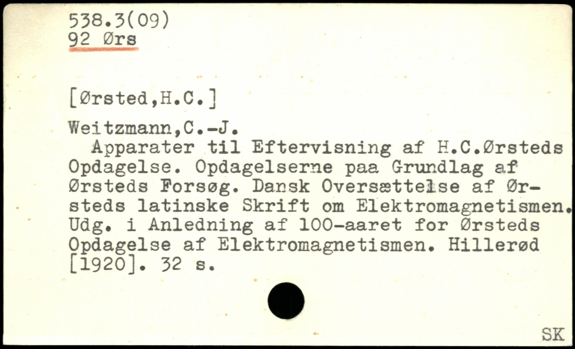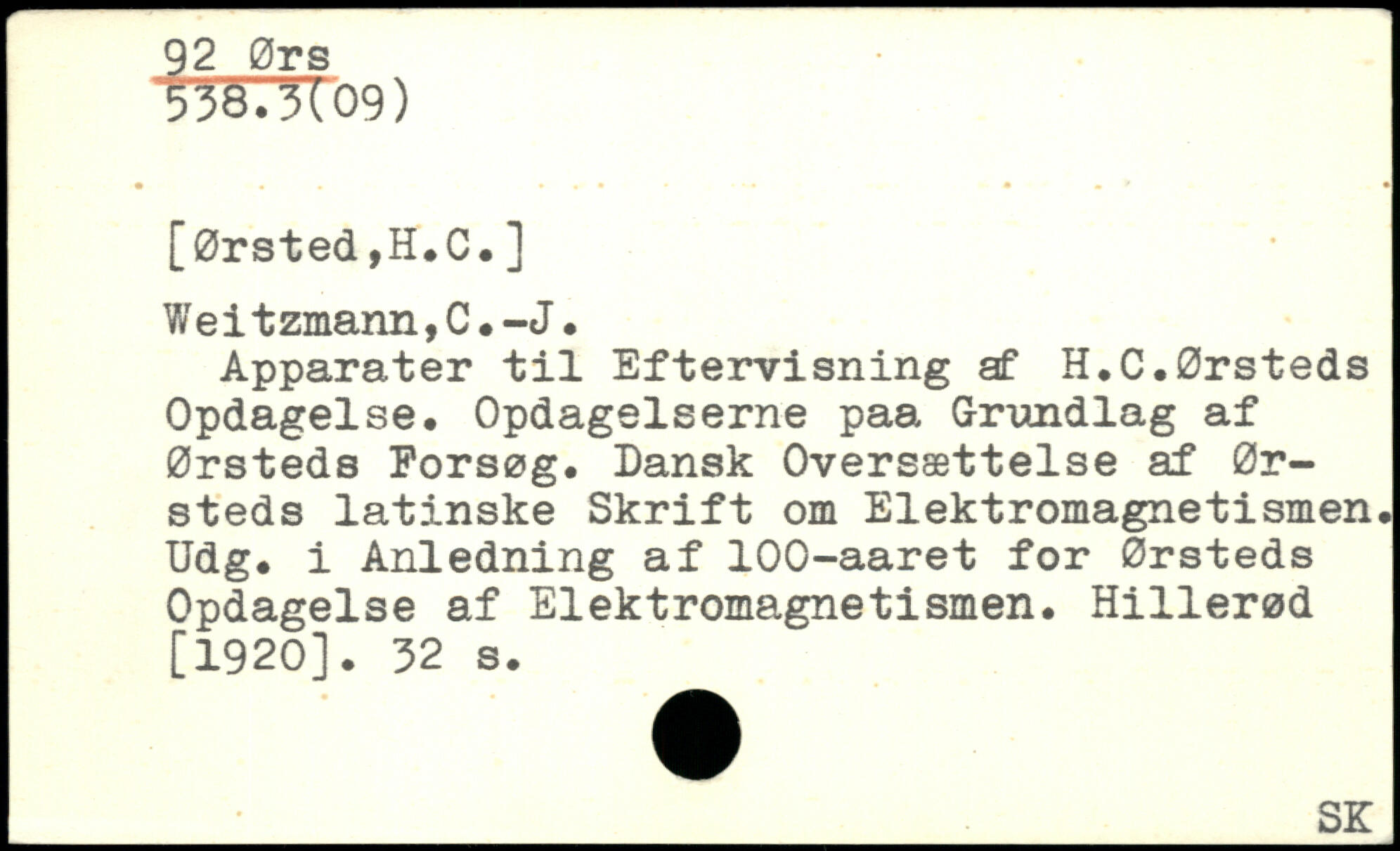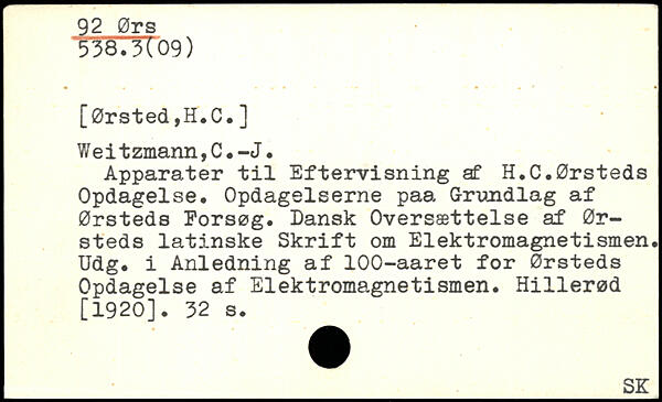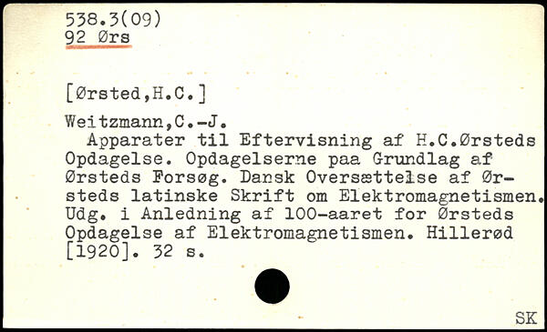 Apparater til Eftervisning af H.C.Ørsteds Opdagelse. Opdagelserne paa Grundlag af Ørsteds Forsøg. Dansk Oversættelse af Ørsteds latinske Skrift om Elektromagnetismen. Udg. i Anledning af 100-aaret for Ørsteds Opdagelse af Elektromagnetismen. Hillerød [1920].