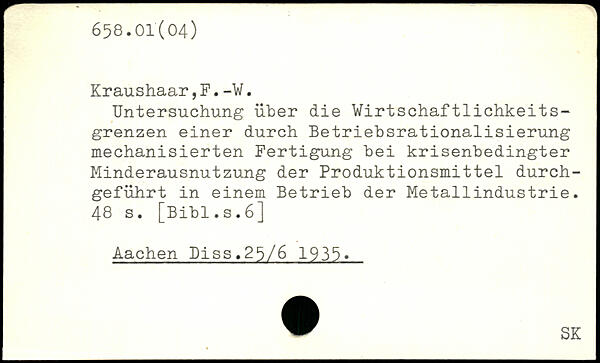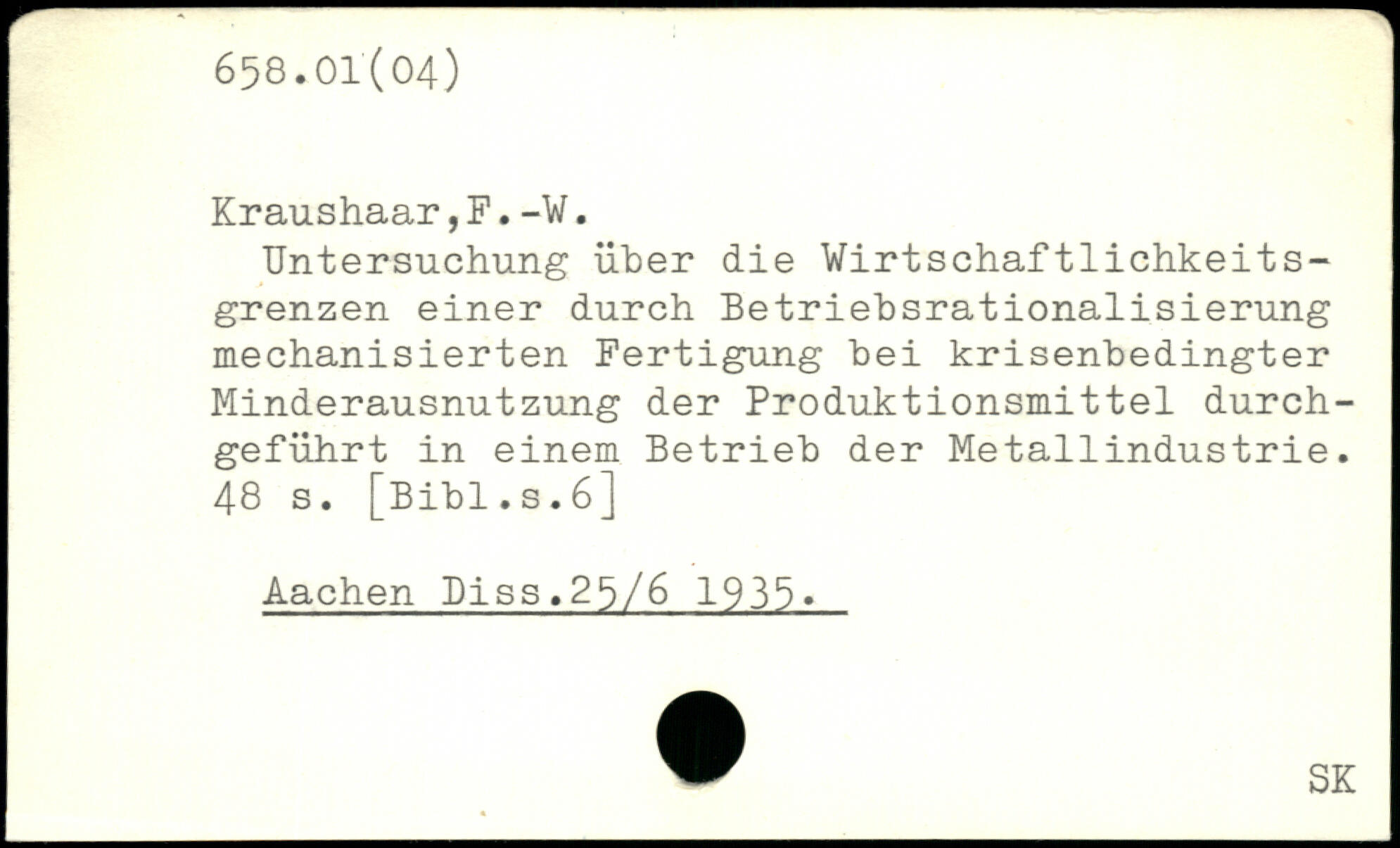 Untersuchung über die Wirtschaftlichkeitsgrenzen einer durch Betriebsrationalisierung mechanisierten Fertigung bei krisenbedingter Minderausnutzung der Produktionsmittel durchgeführt in einem Betrieb der Metallindustrie.