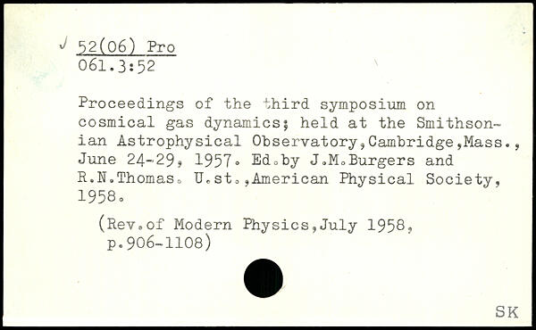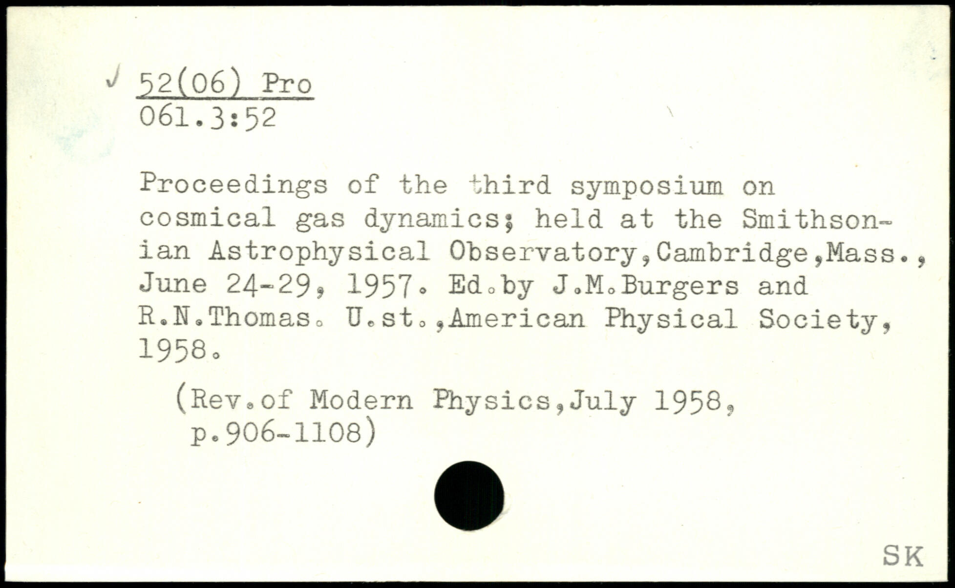 Proceedings of the third symposium on cosmical gas dynamics? held at the Smithsonian Astrophysical Observatory,Cambridge,Mass., June 24-29j 1957, Edoby J.MoBurgers and R.lTaThomas. U.sto ,American Physical Society, 1958o (Rev.of Modern Physics,July 1958, p.906-1108)