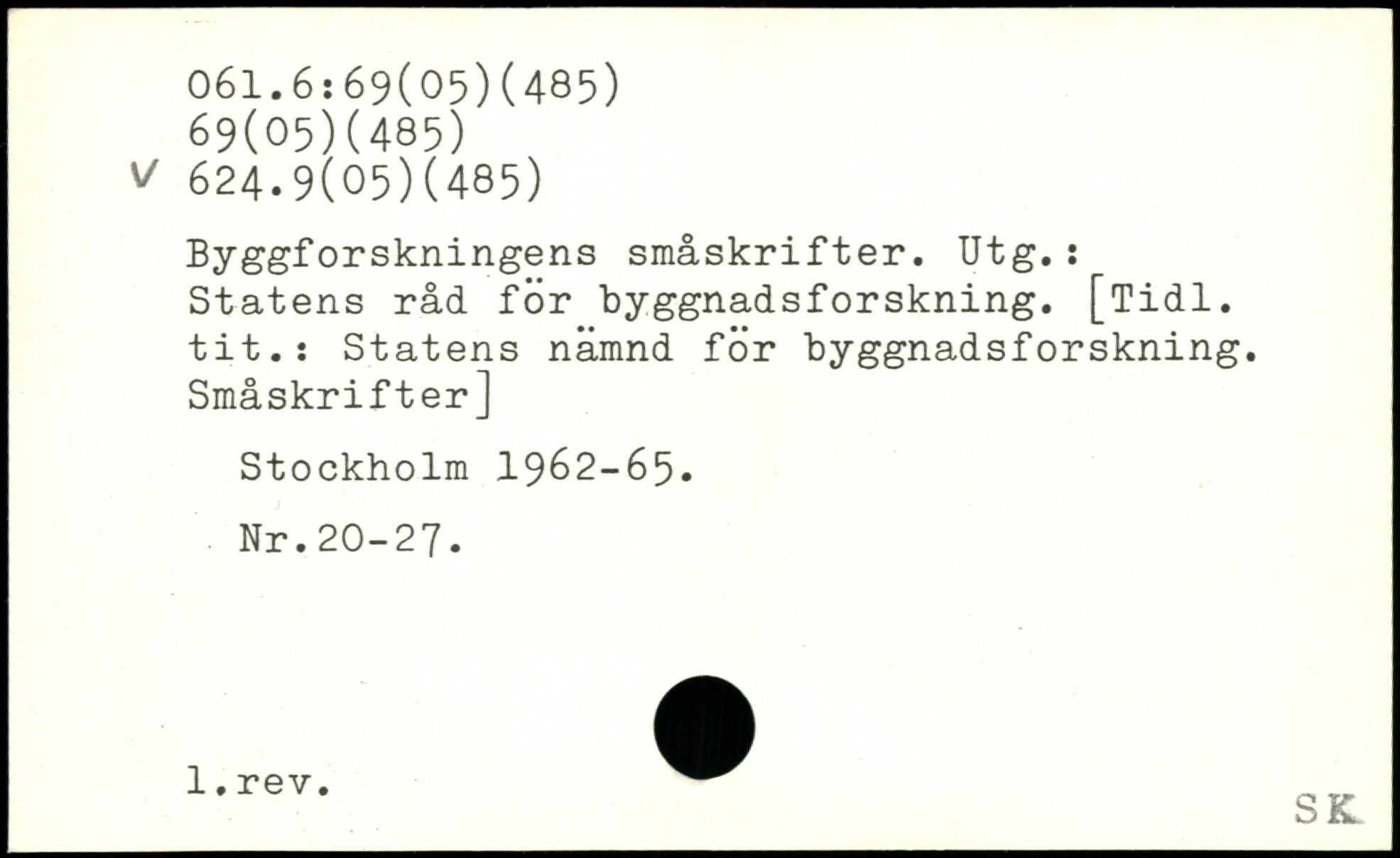Byggforskningens småskrifter. Utg.: Statens råd för byggnadsforskning. [Tidl. tit.: Statens nämnd för byggnadsforskning. Småskrifter]