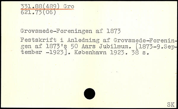 Grovsmede-Foreningen af 1873 Festskrift i Anledning af G-rovsmede-Forenin-gen af 1873's 50 Aars Jubilæum. [1873-9.September -1923].