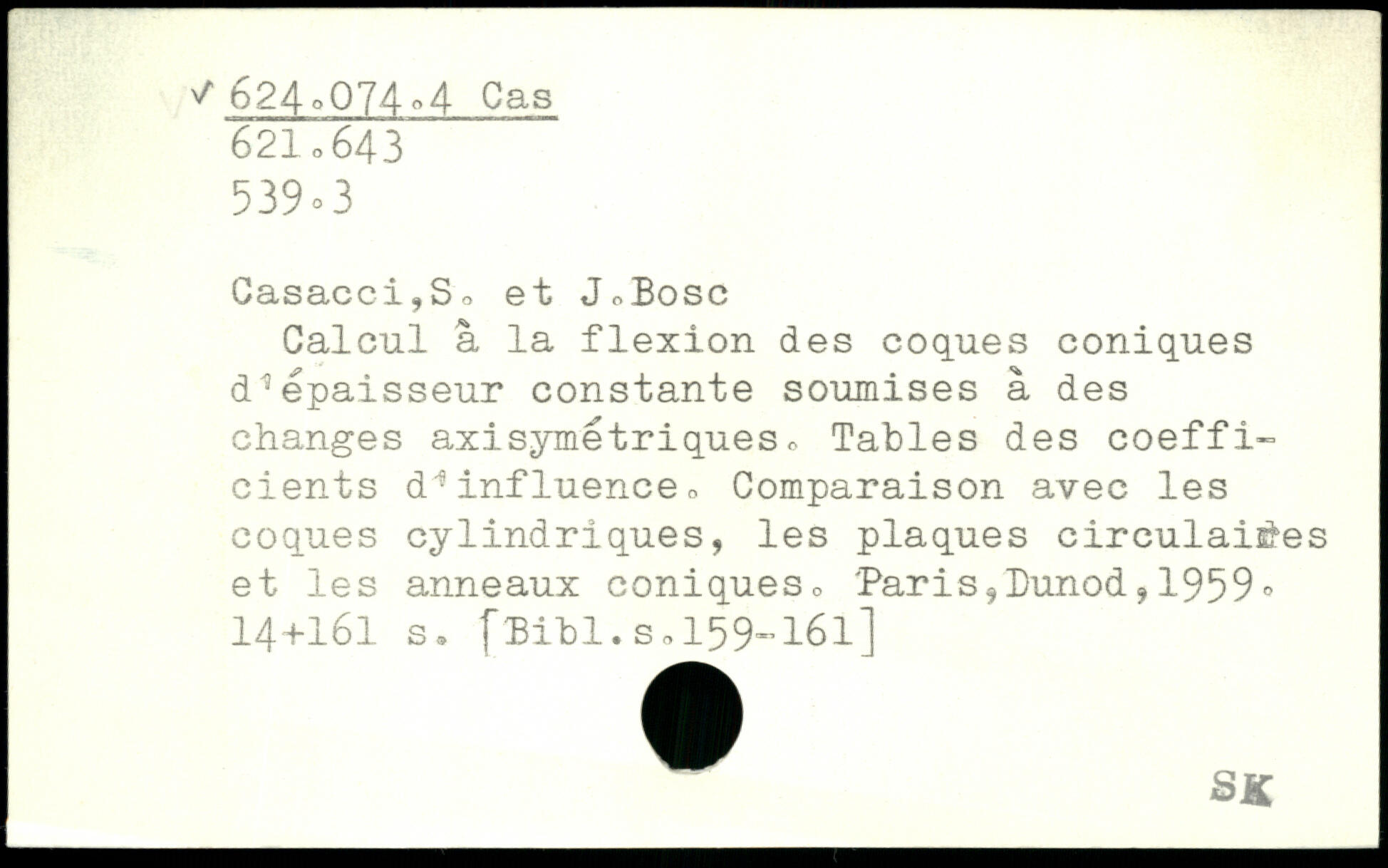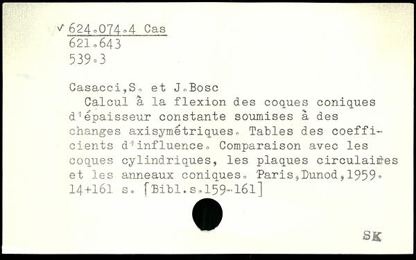 Calcul â la flexion des coques coniques d"3épaisseur constante soumises à des changes axisymétriques. Tables des coefficients d1influencée Comparaison avec les coques cylindriques, les plaques circulaires et les anneaux coniques, '