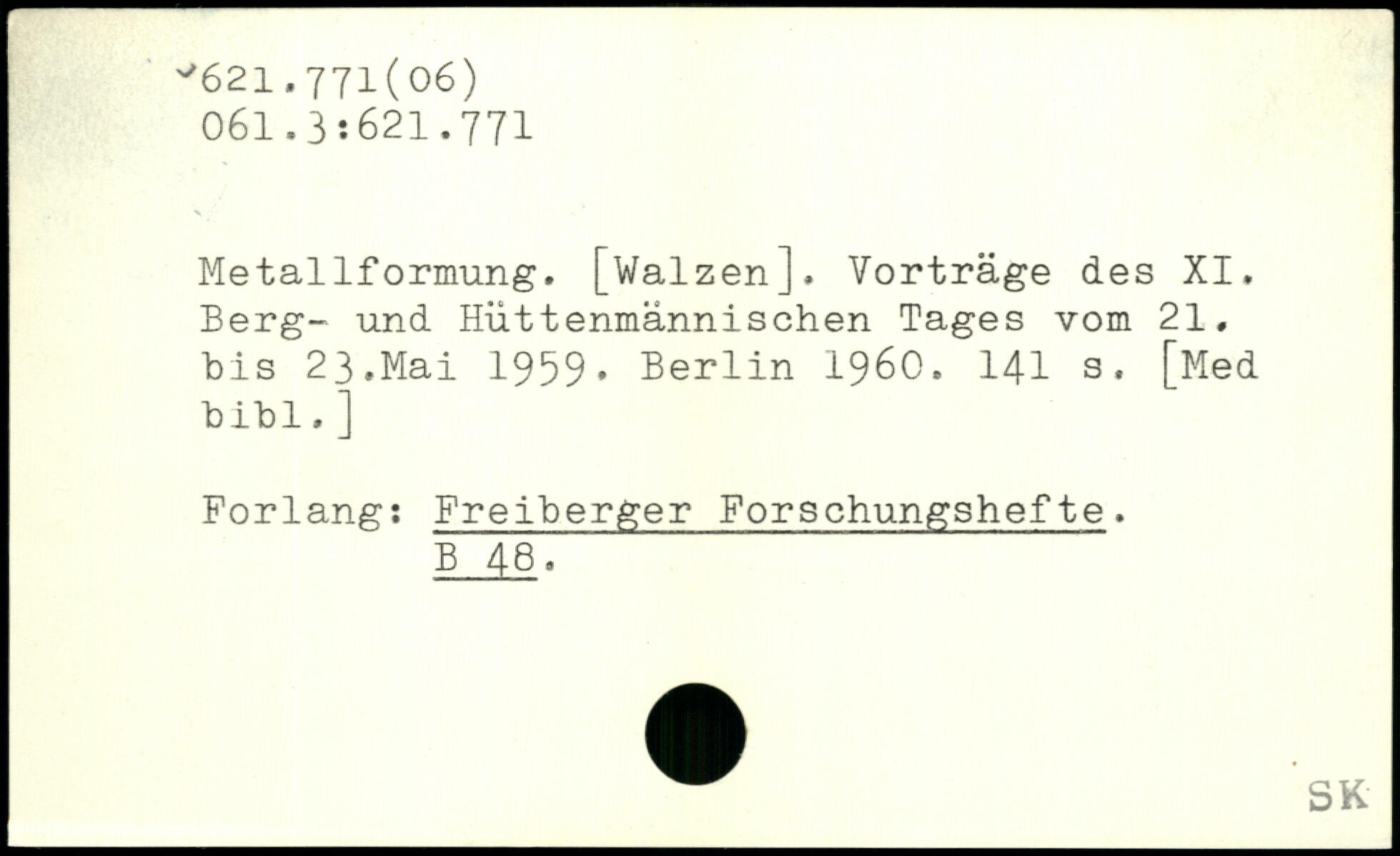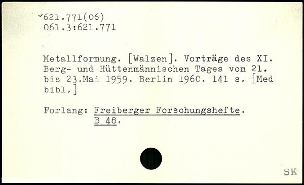 Metallformung. [Walzen]. Vorträge des XI. Berg- und Hüttenmännischen Tages vom 21. bis 23.Mai 1959.