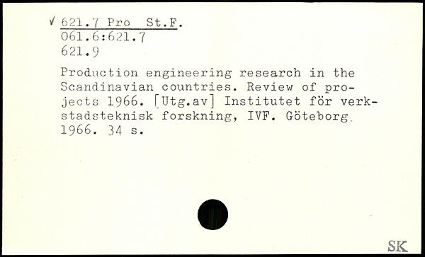 Production engineering research in the Scandinavian countries. Review of projects 1966. [Utg.av] Institutet for verk-stadsteknisk forskning, IVF. Göteborg. 1966.