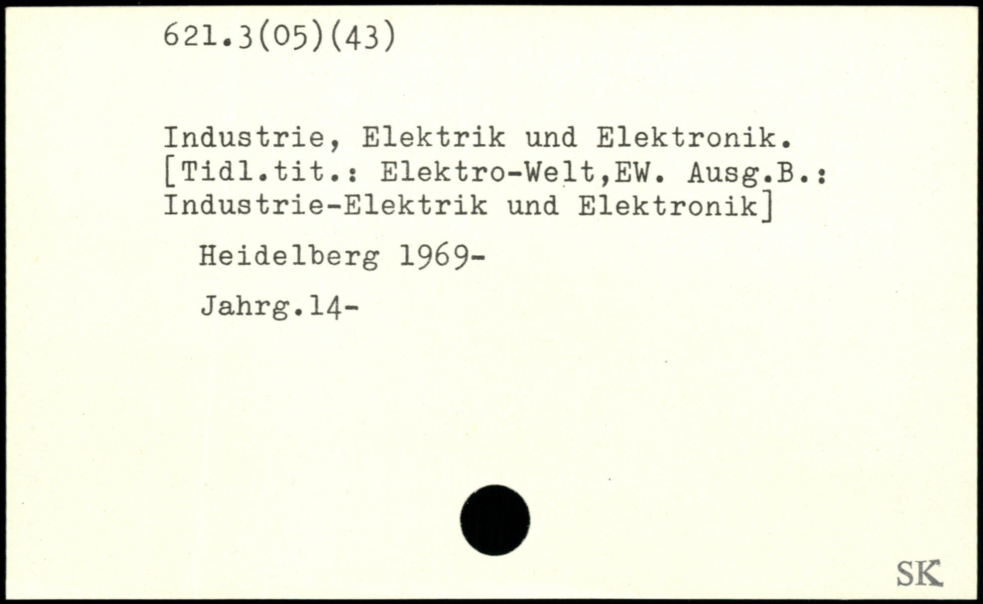 Industrie, Elektrik und Elektronik. [Tidl.tit.: Elektro-Welt,EW. Ausg.B.: Industrie-Elektrik und Elektronik] Heidelberg 1969- Jahrg.14-