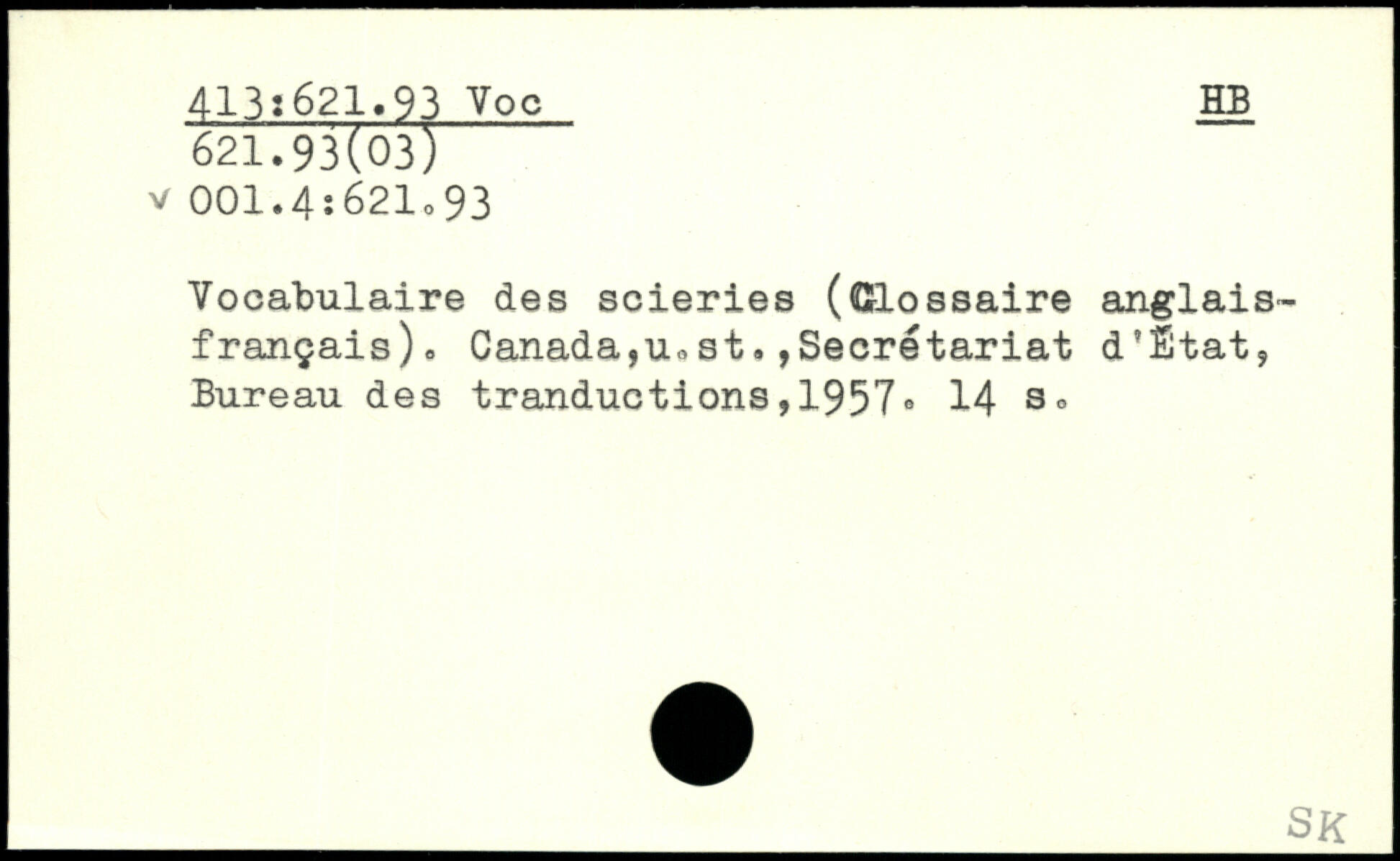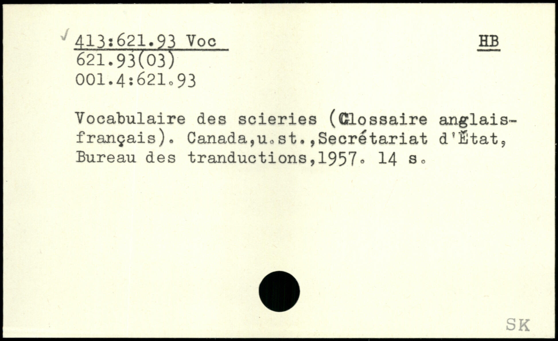 Vocabulaire des scieries (Glossaire anglais-français). Canada,u.st,,Secrétariat d'Ëtat, Bureau des tranductions,1957® 14 3.
