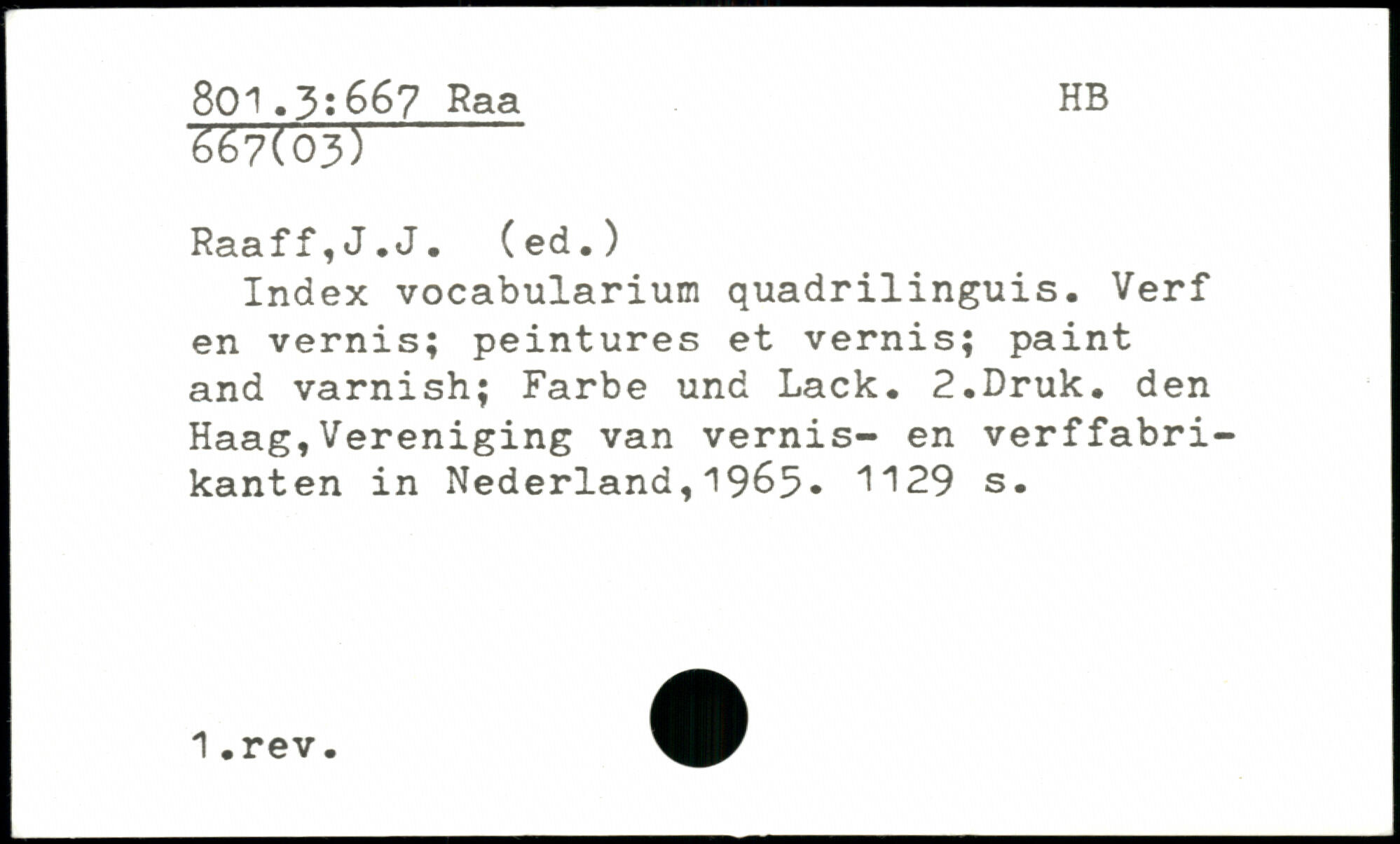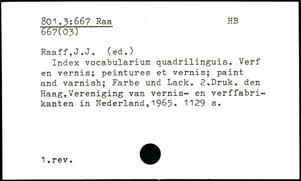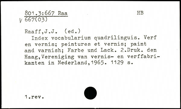 Index vocabularium quadrilinguis. Verf en vernis; peintures et vernis; paint and varnish; Farbe und Lack. 2.Druk. den Haag,Vereniging van vernis- en verffabri-kanten in Nederland,1965