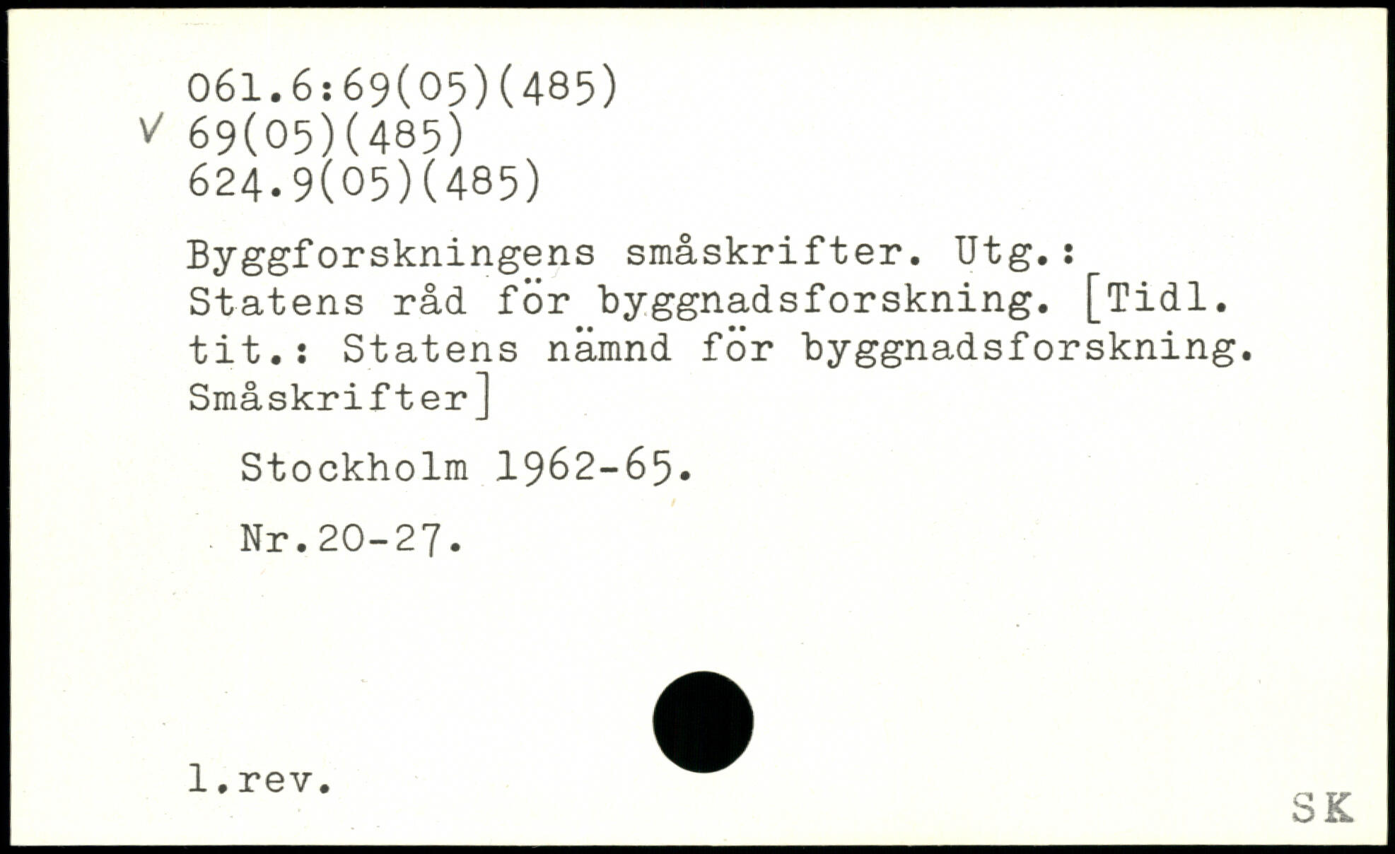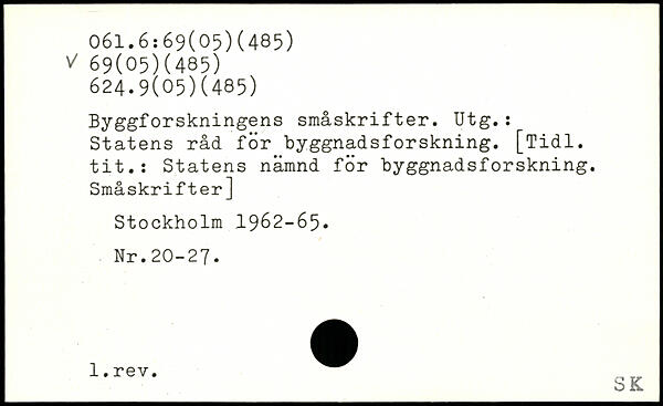 Byggforsk1111igêns småskrifter. Utg. : Statens råd för byggnadsforskning. [Tidl. tit.: Statens nämnd för byggnadsforskning. Småskrifter]