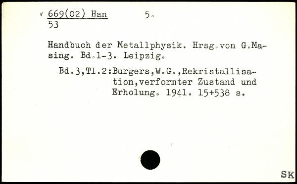 Handbuch der Metallphysik. Hrsgovon G.Ma-singo Bdol-3, Leipzigo Bd0 3 >T1.2iBurgers,W0 G0,Rekristallisation, verformter Zustand und Erholung,, 1941