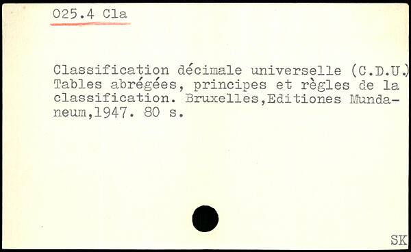 Classification décimale universelle (C.D.U.) Tables abrégées, principes et règles de la classification.