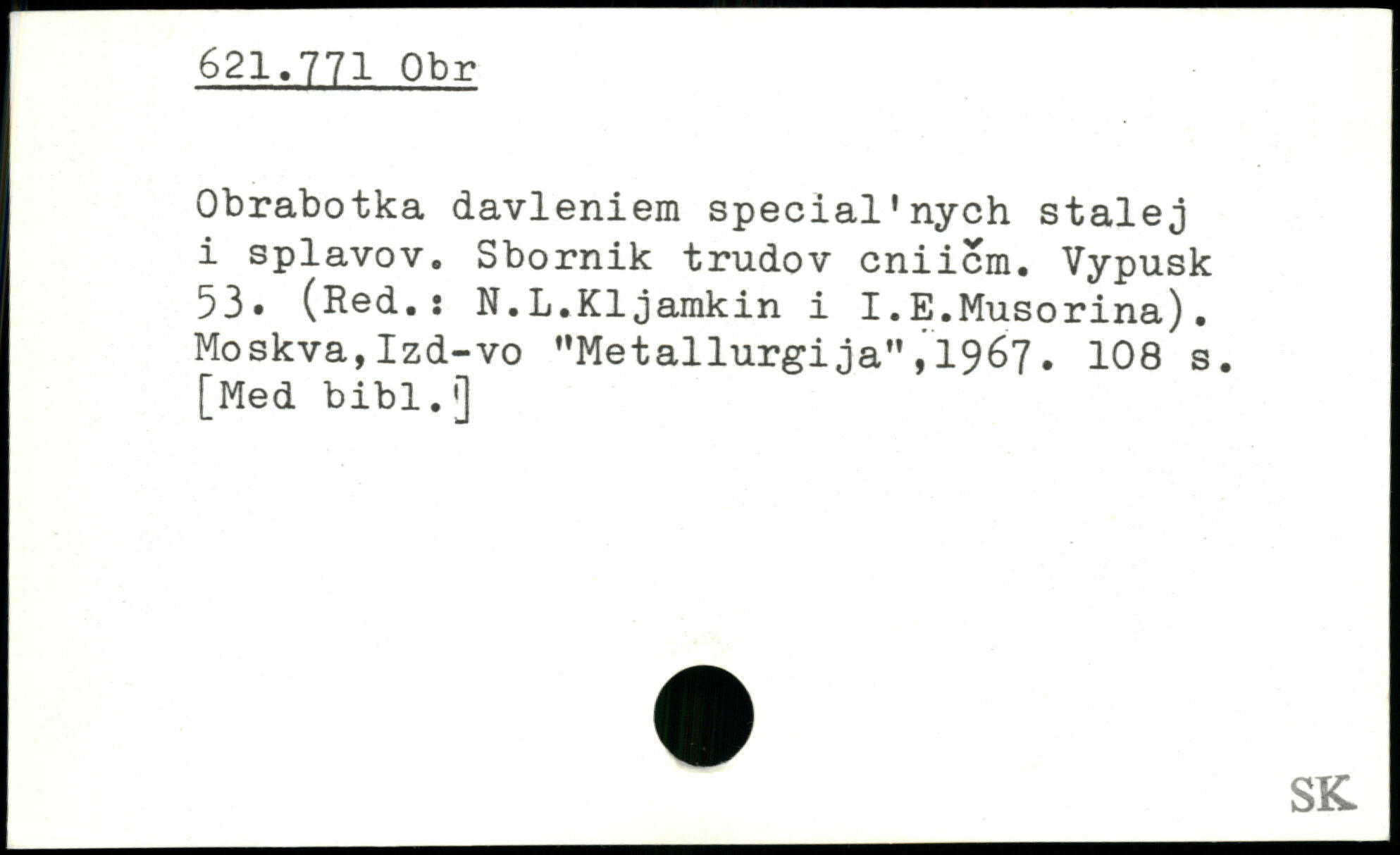Obrabotka davleniem special'nych stalej i splavov. Sbornik trudov cniicm. Vypusk 53. (Red.: N.L.Kljamkin i I.E.Musorina). Moskva,Izd-vo "Metallurgija",1967.