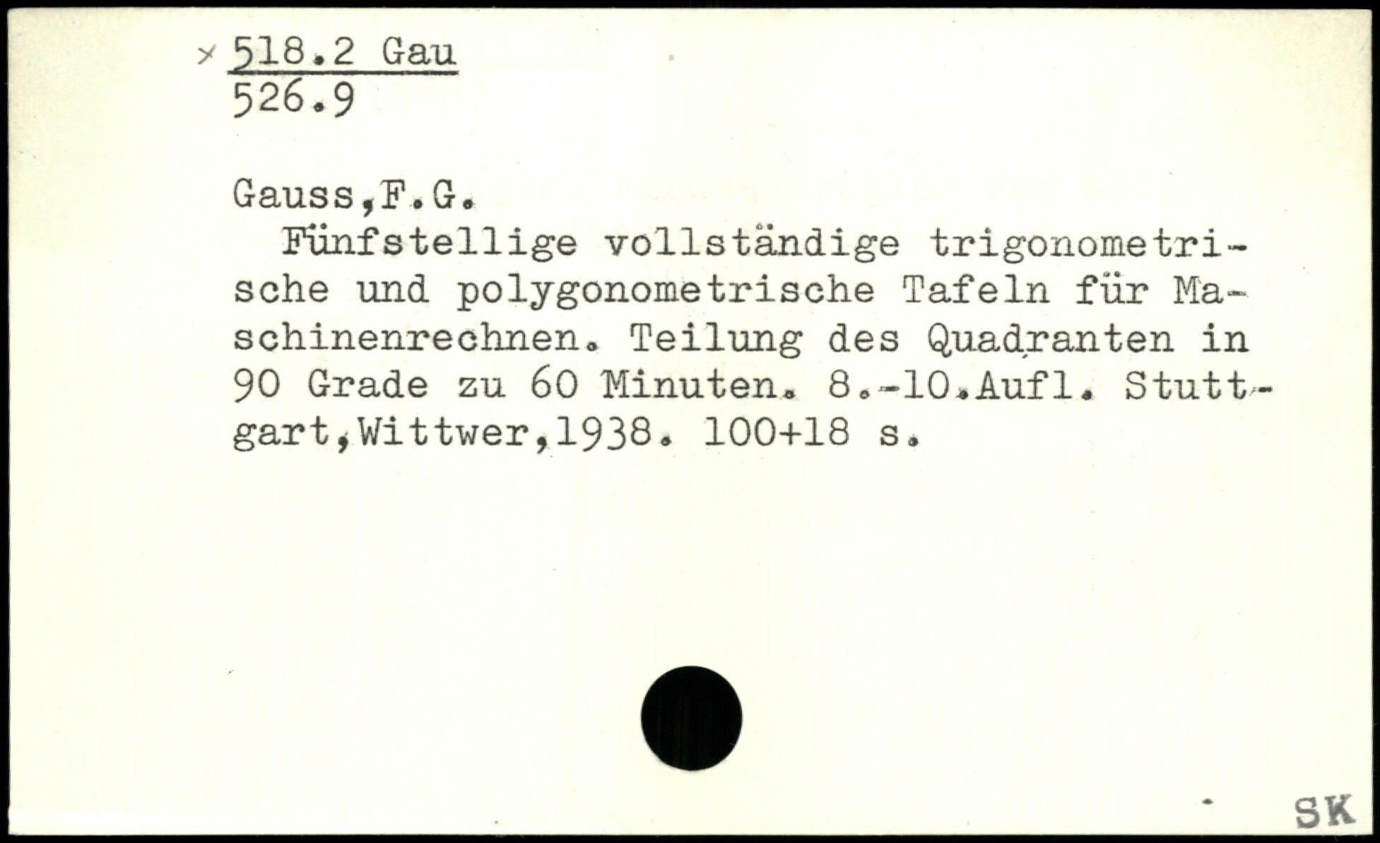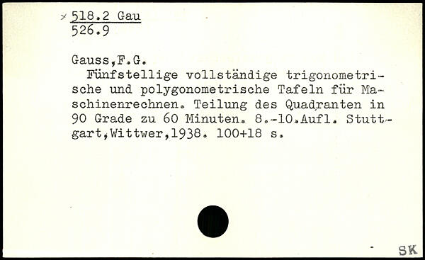 Fünfstellige vollständige trigonometrische und polygonometrisehe Tafeln für Maschinenrechnen. Teilung des Quadranten in 90 Grade zu 60 Minuten. 8.-