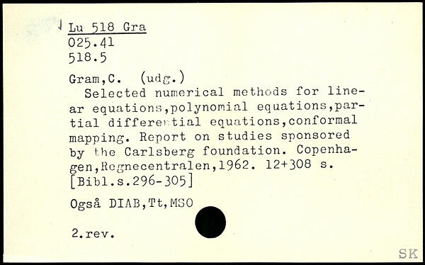Selected numerical methods for linear equations,polynomial equations,partial differential equations,conformal mapping. Report on studies sponsored by the Carlsberg foundation. Copenhagen ,Regnecentralen , 19^2.