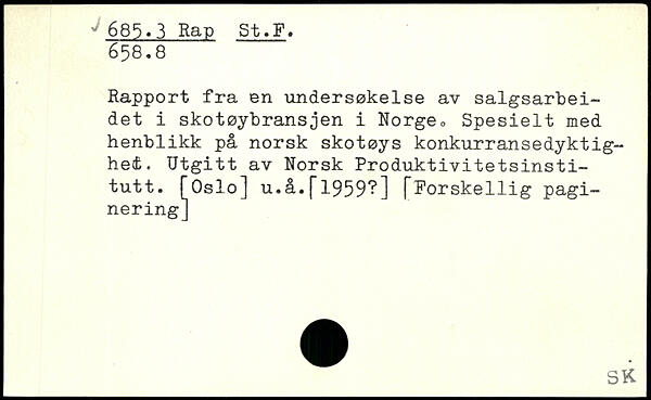 Rapport fra en undersøkelse av salgsarbei-det i skotøybransjen i Norge,, Spesielt med henblikk på norsk skotøys konkurransedyktig-het. Utgitt av Norsk Produktivitetsinsti-tutt. [Oslo] u.å.f1959?] [Forskellig paginering]