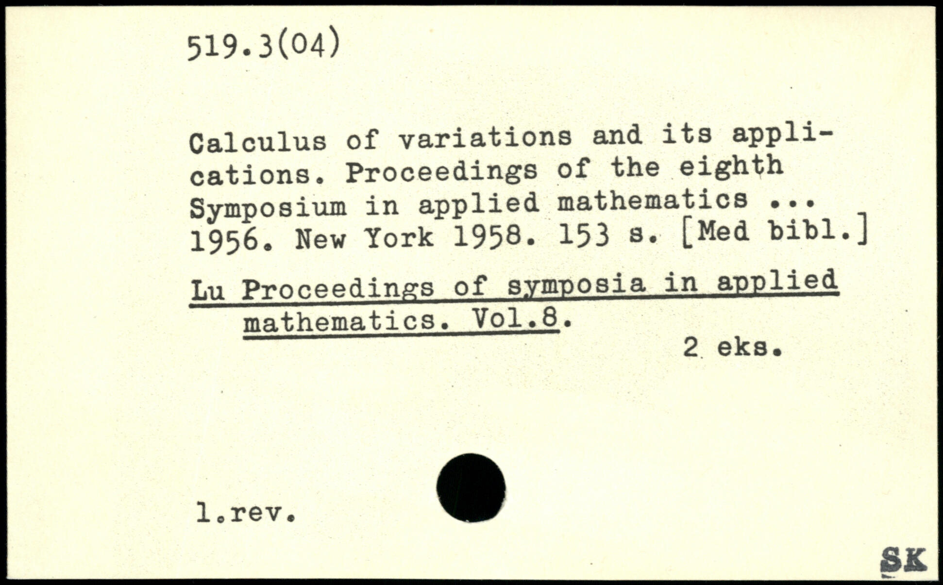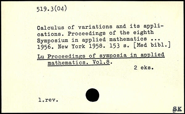 Calculus of variations and its applications. Proceedings of the eighth Symposium in applied mathematics ... 1956.